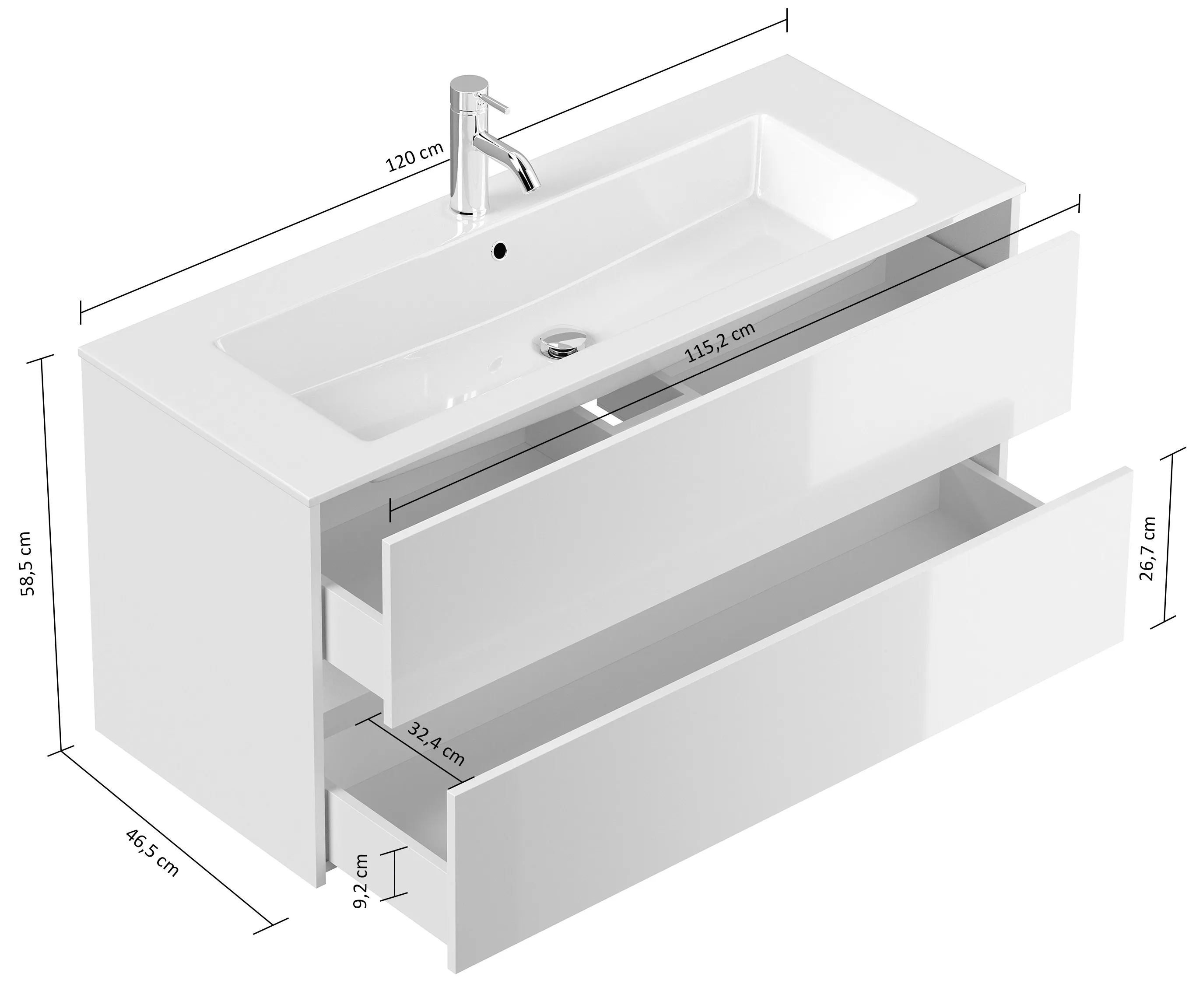 Badmöbel-Unterschrank Limes mit 2 Schubladen und Waschbecken Mineralguss mit Überlauf (B/H/T)120/58,5/46,5 cm