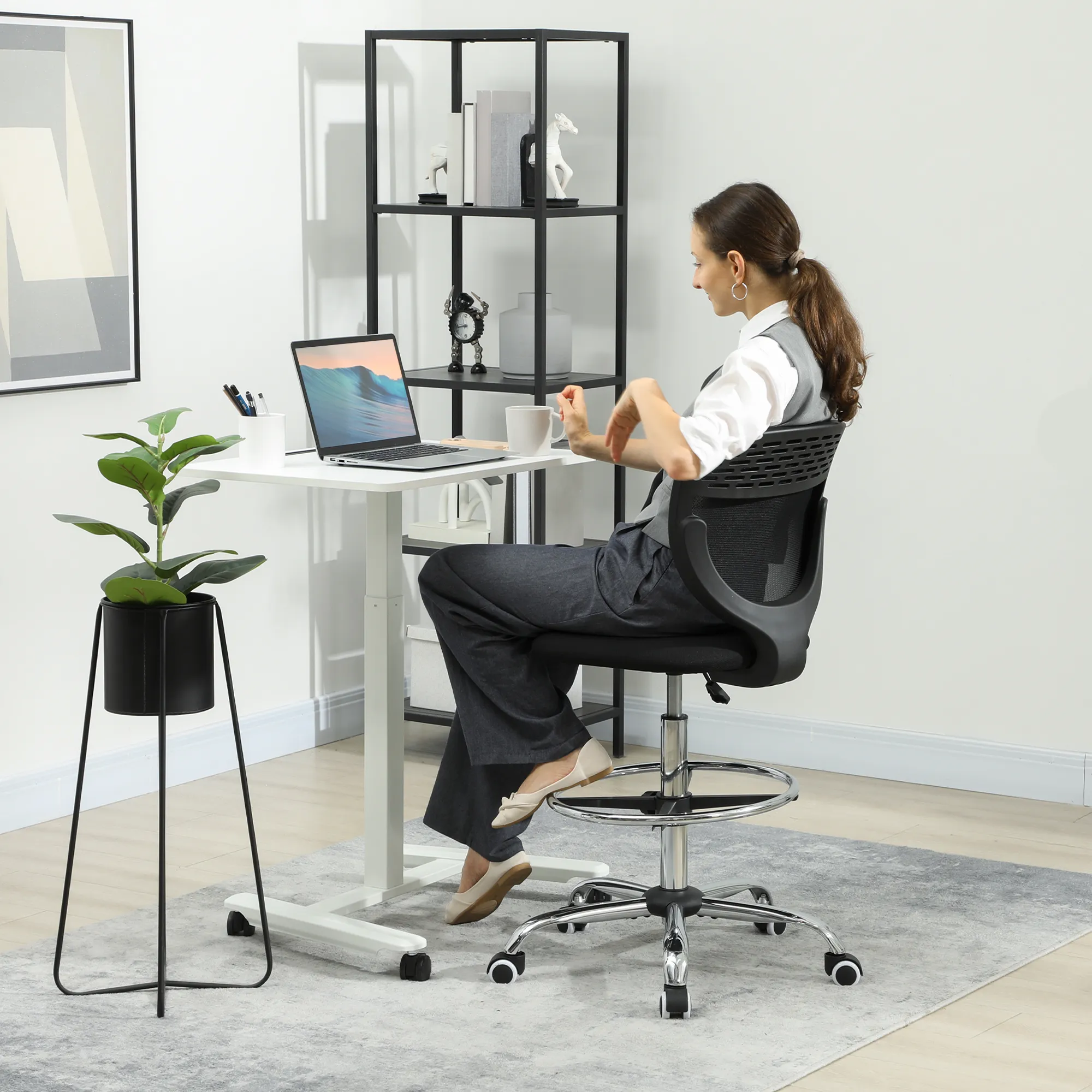 Finden Sie den idealen Stuhl für hohe Arbeitstische mit dem Bürostuhl. Die Sitzhöhe lässt sich von 68-88 cm anpassen, um eine optimale Sitzposition zu gewährleisten und Körperbelastungen zu vermeiden. Komfort bietet der gepolsterte Sitz und die hohe Rückenlehne. Das armlose Design und der drehbare Sitz des Schreibtischstuhls erhöhen Ihre Bewegungsfreiheit. Inklusive verstellbarer Fußstütze.