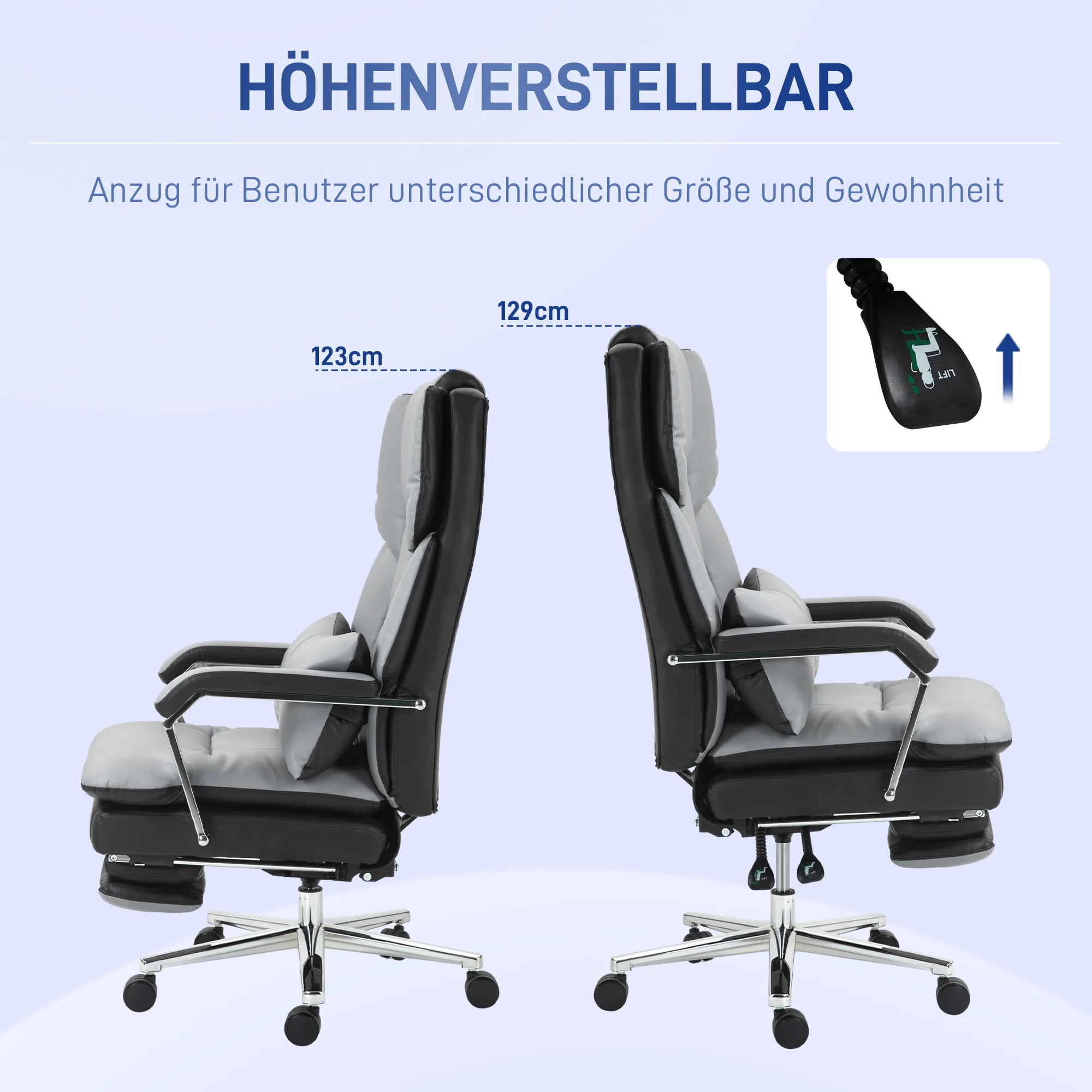 - Hohe Rückenlehne, dicke Schaumstoffpolsterung, ausziehbare Fußstütze und eine abnehmbare Lendenstütze sorgen für Komfort