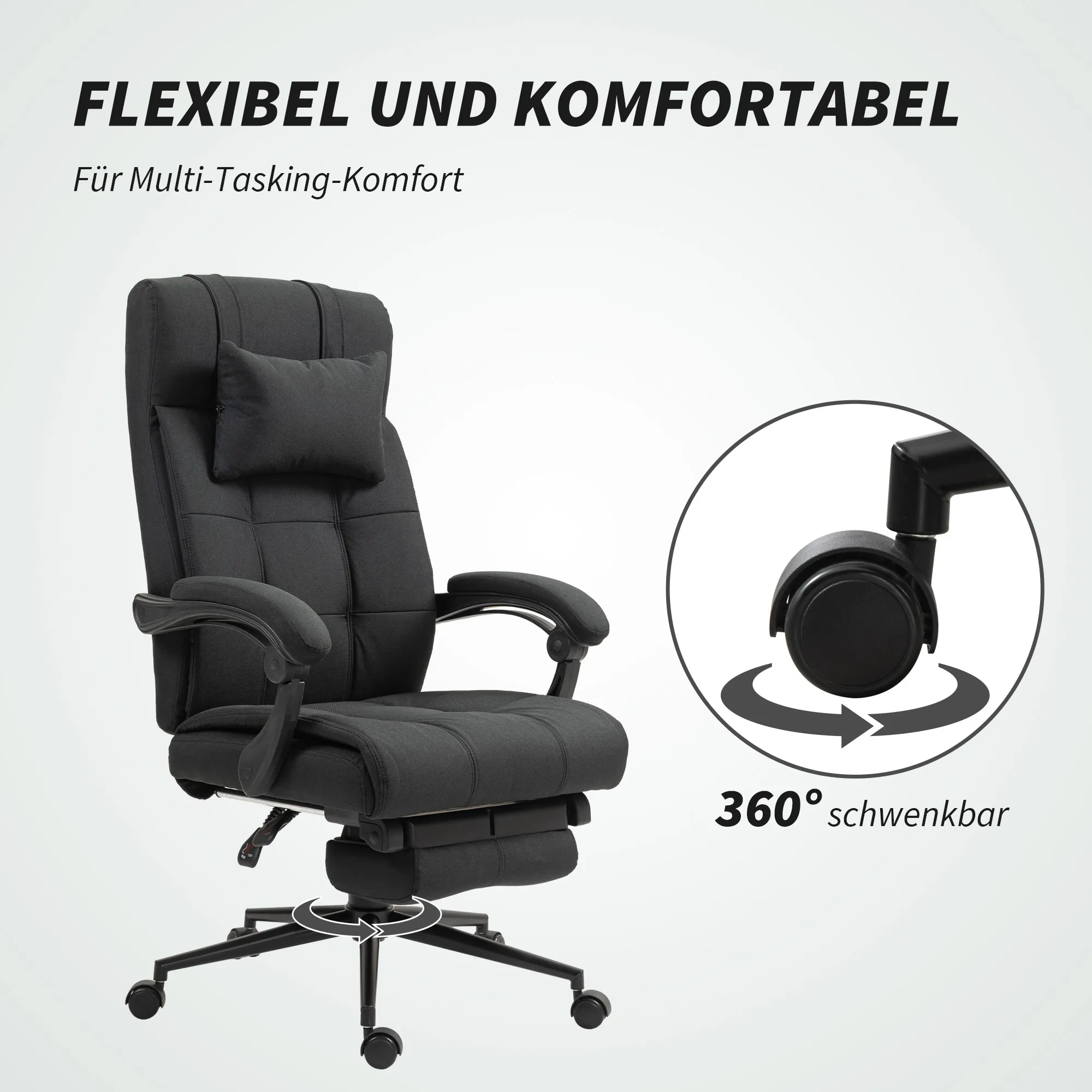 Bürostuhl mit Fußstütze, Schreibtischstuhl, Drehstuhl mit Kopfstütze, Schwarz