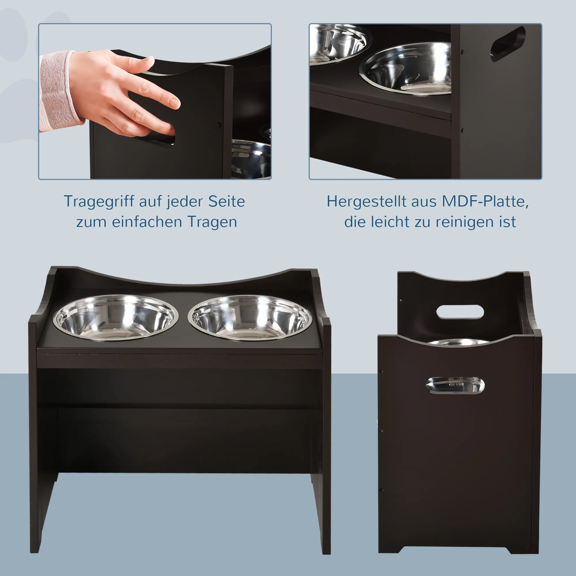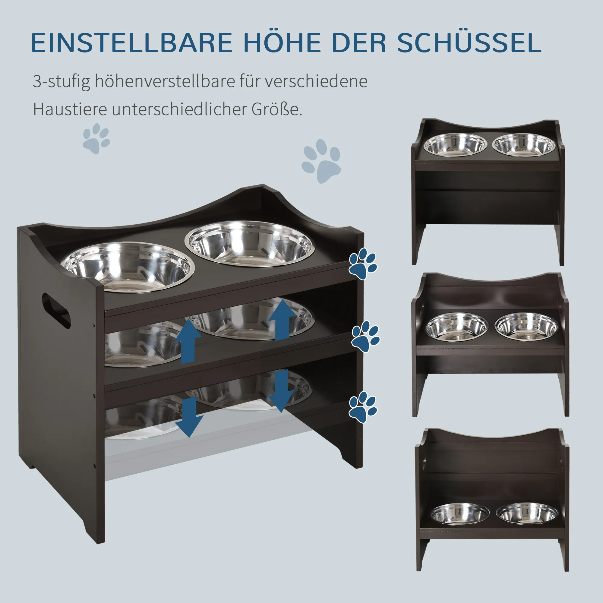 Diese Futterstation bietet eine bequeme und einfache Möglichkeit, Ihren lieben kleinen Freund zu füttern. Hergestellt aus solidem und natürlichem MDF-Material der Güteklasse P2, sowie Edelstahl, ist die Futterstation rostbeständig, ungiftig und robust. Der Napf ist abnehmbar, Sie können das Futter/Wasser leicht einfüllen und die Schalen einfach reinigen. Die Höhe des Fressnapf-Gestells ist 3-stufig einstellbar, so dass der Futterstation Ihren Hund vom Welpen bis zum hohen Alter begleiten kann. Außerdem kann der Ständer mit erhöhtem Design ausgestattet werden, was die Belastung für Nacken, Rücken und Gelenke des Hundes verringert. Darüber hinaus ist unser Futterstation aus dunkelbrauner Holzpaneelen, Sie können ihn mit Ihren anderen Wohnmöbeln kombinieren.