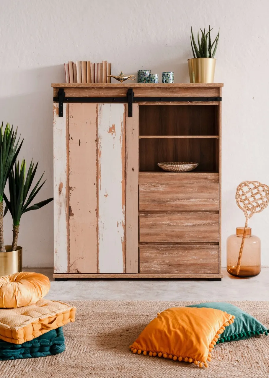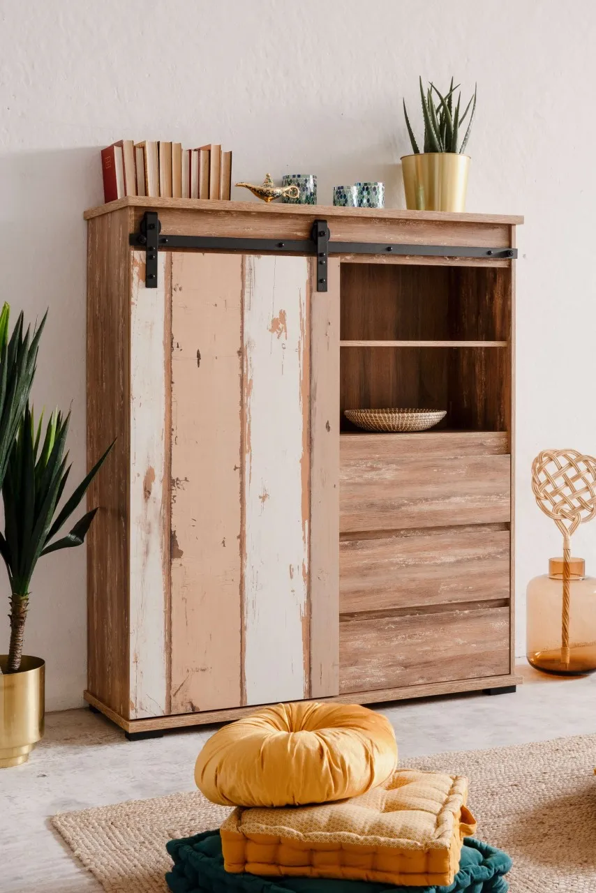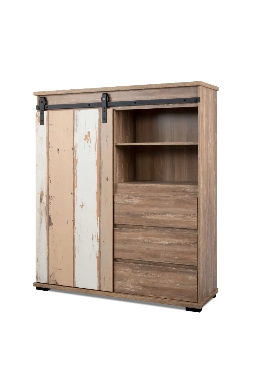 finori Highboard Marrakesch Valhalla Eiche / Milford Kiefer mit Schiebetür, Schubkästen und offenen Fächern