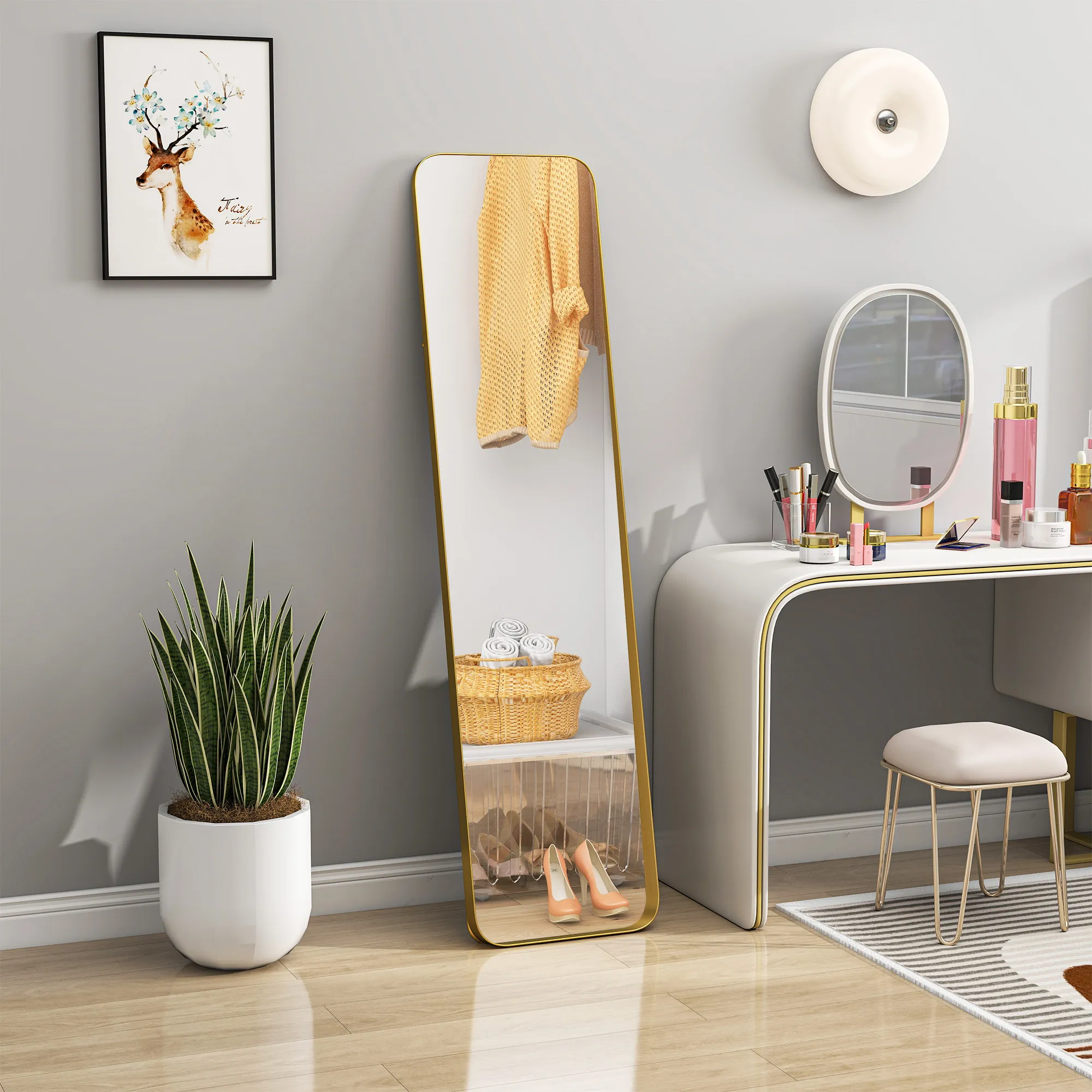 Betrachten Sie sich vollständig mit dem Ganzkörperspiegel, einem beeindruckenden Highlight für jeden Raum. Dieser hohe Flurspiegel (160 x 40 cm) ermöglicht eine komplette Ansicht Ihres Körpers und verfügt über eine Kippfunktion für die ideale Sicht. Der goldfarbene verjüngenden Rahmen sorgt nicht nur für einen eleganten Touch, sondern auch für sicheren Stand, egal ob frei stehend oder an die Wand Ihres Schlafzimmers gelehnt.