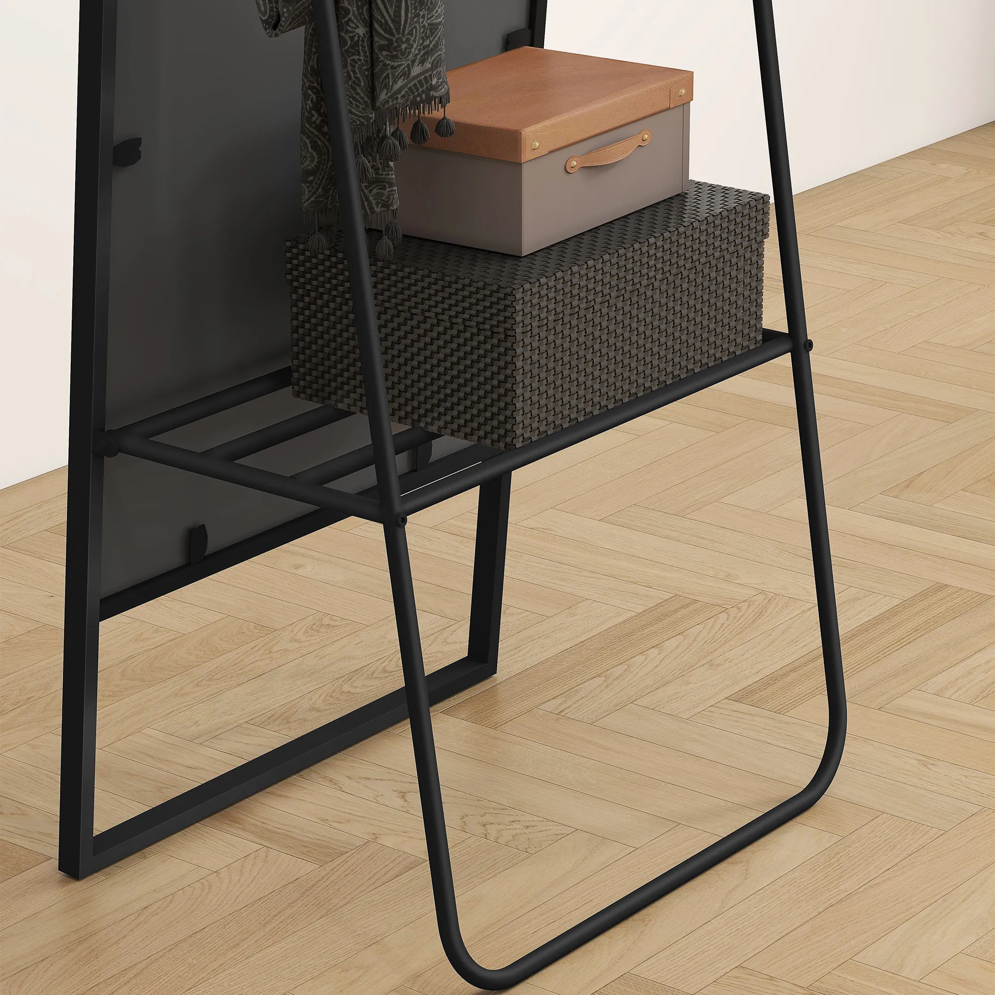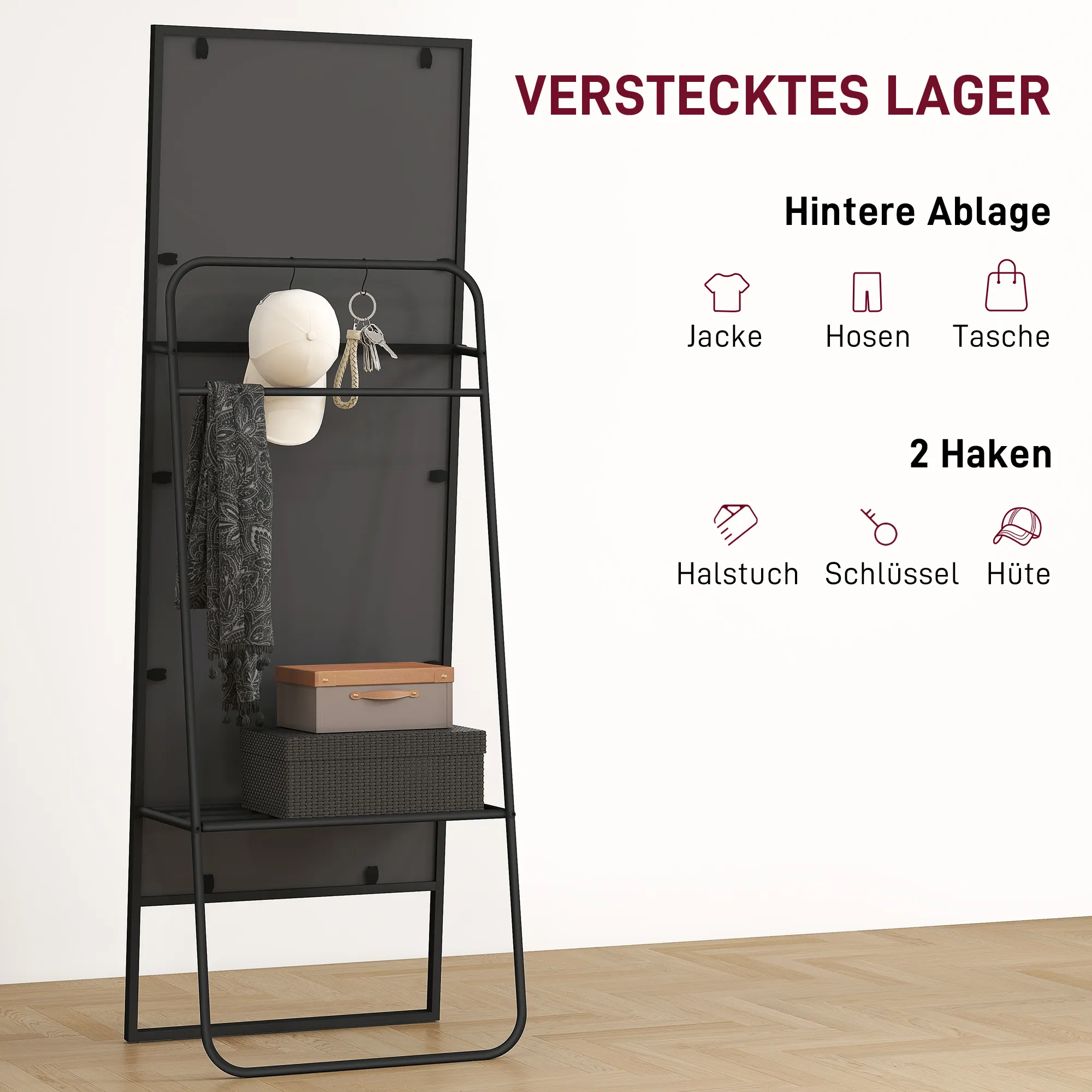 - Ein hinteres Regal und zwei Haken des Stehspiegels erleichtern das praktische Aufhängen von Accessoires