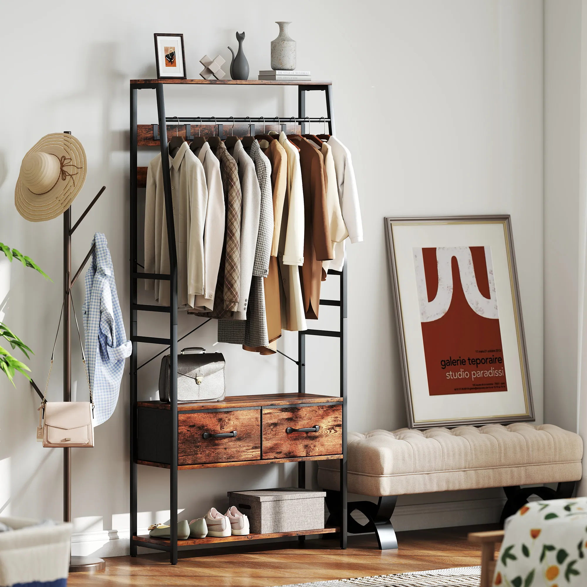 - 6-in-1-Design: Oberes Regal, Kleiderstange, 10 Haken, Schuhbank, zwei Stoffschubladen und Schuhregal in einem.