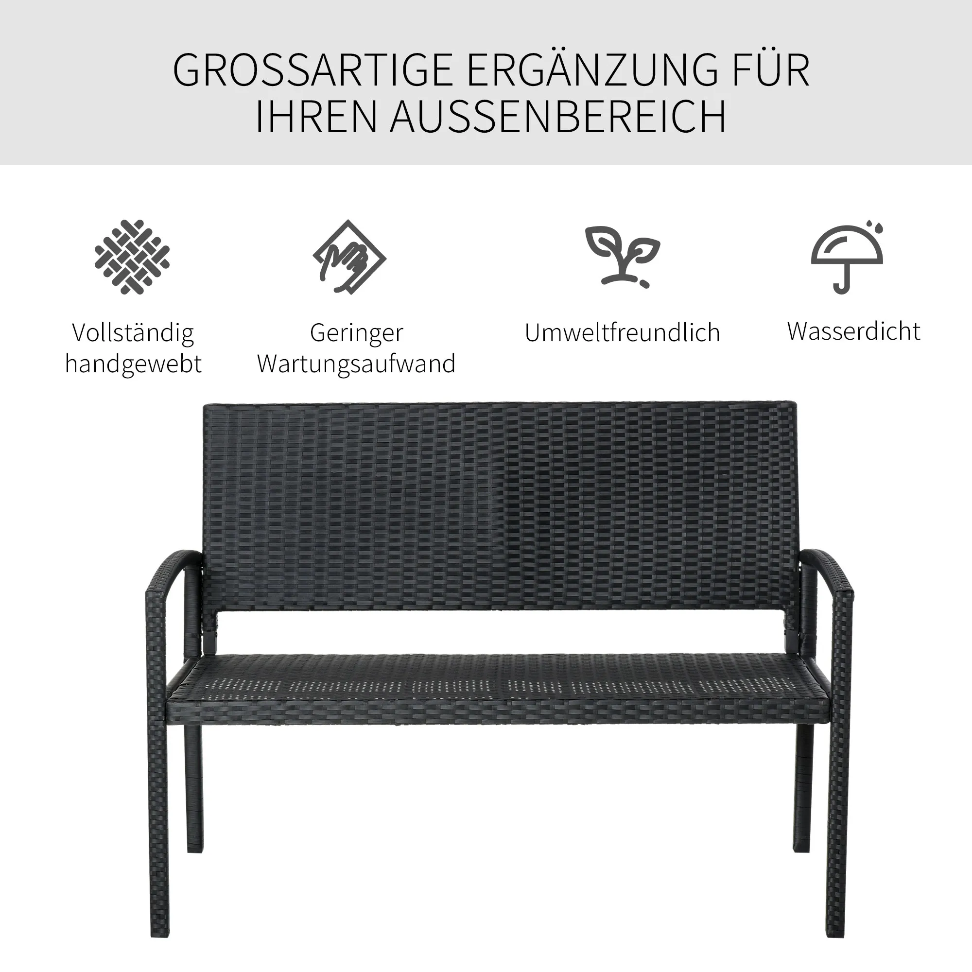 Für entspannte Momente im heimischen Grün ist unsere Polyrattanbank von eine ausgezeichnete Wahl. Die Gartenbank verfügt über einen robusten Stahlrahmen, während Sitz und Rücklehne aus handgeflochtenem Kunstrattan bestehen, der für einen hohen Sitzkomfort und eine optimale Witterungsbeständigkeit sorgt. Somit können sich bis zu zwei Personen hier bequem niederlassen und eine wundervolle, entspannte Zeit im Freien verbringen. Heißen Sie die warmen Sommertage willkommen!