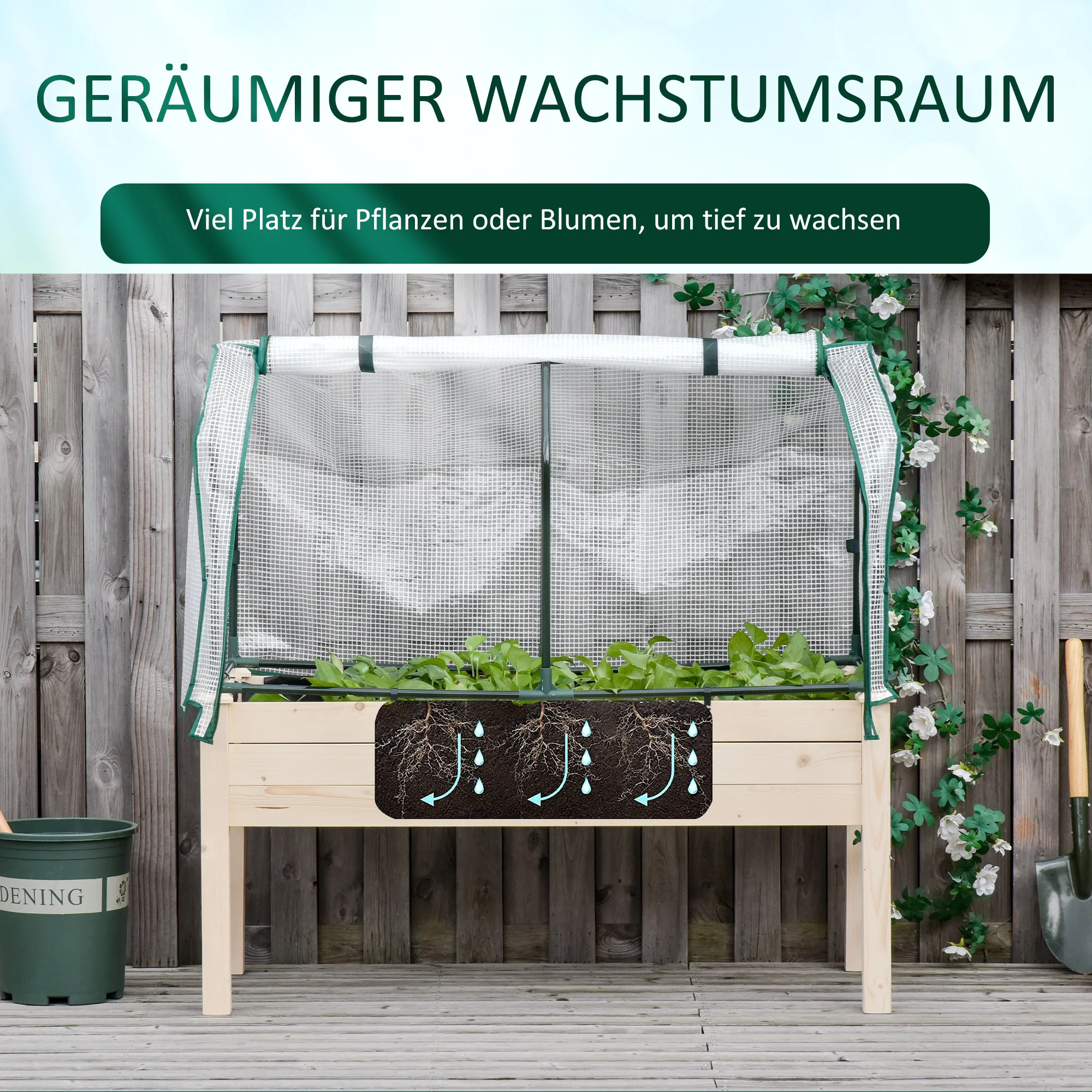 Unserer Blumenkasten ist eine ideale Möglichkeit, um Kräuter, Blumen und Gemüse zu Hause anzubauen. Dieser Pflanzkasten hält den Boden frei von Unkraut, verhindert Bodenverdichtung und bietet eine hervorragende Drainage. Das einzigartige Design und die Folienabdeckung sorgen für eine ideale Temperatur im Inneren und schützen Ihre Pflanzen vor Witterung und Tieren. Erschaffen Sie noch heute ein kleines Gartenparadies mit diesem Blumenkasten von !