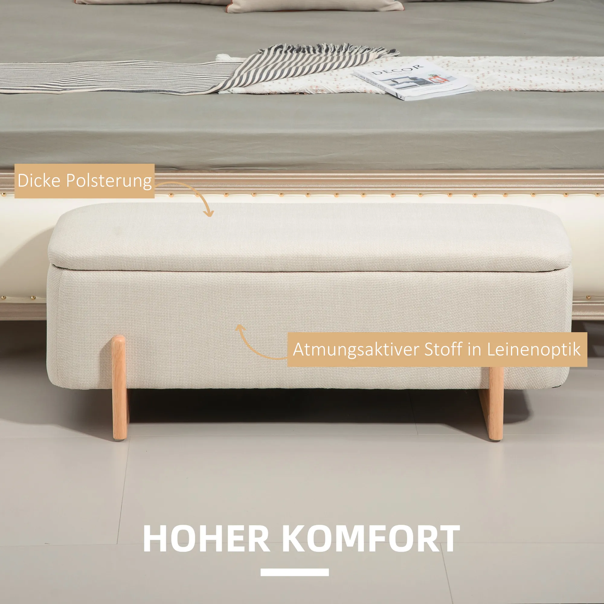 - Kann als Bank am Fußende des Bettes, Fensterbank oder Eingangsbank verwendet werden