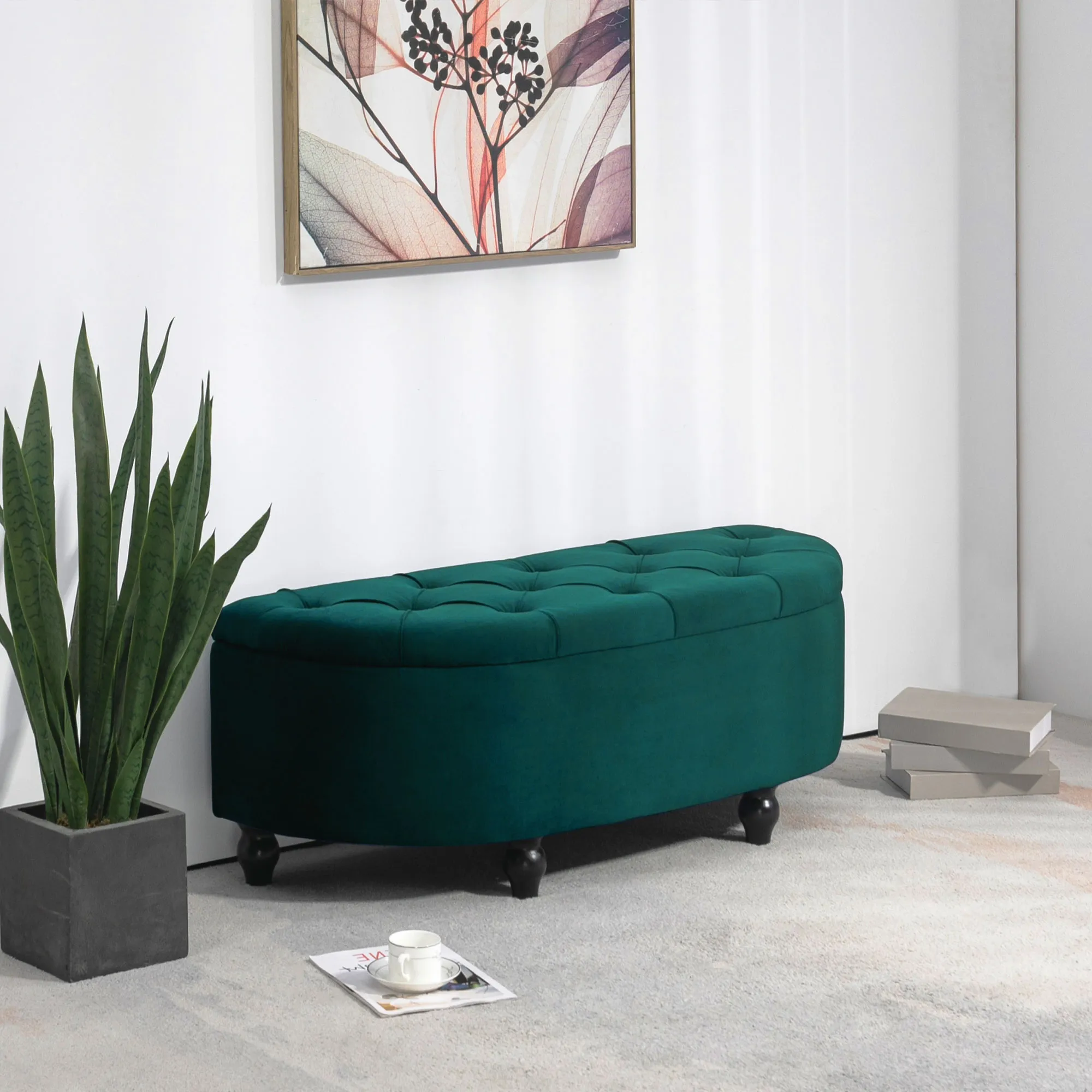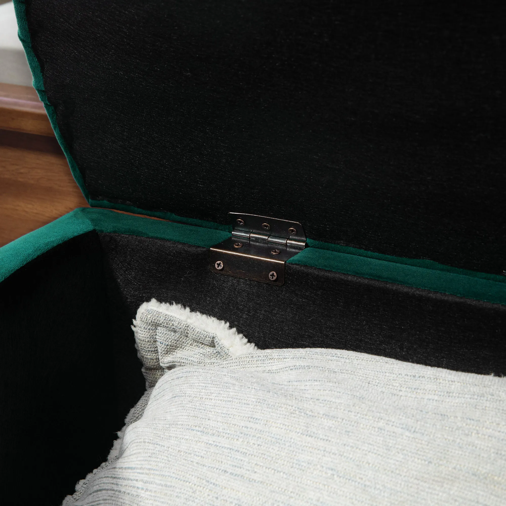 Erleben Sie zeitlose Eleganz mit unserem exquisiten Hocker mit Stauraum. Die kunstvoll gearbeiteten Beine aus schwarzem Gummiholz und der edle dunkelgrüne Samtbezug verleihen Ihrem Wohnzimmer, Schlafzimmer, Ankleidezimmer oder Büro einen Hauch von klassischem Chic. Nutzen Sie den großzügigen Stauraum für Decken, Kissen, Fernbedienungen oder Magazine. Diese Bank mit Stauraum ist nicht nur ein stilvolles Möbelstück, sondern auch ein praktischer Ordnungshelfer für Ihr Zuhause.