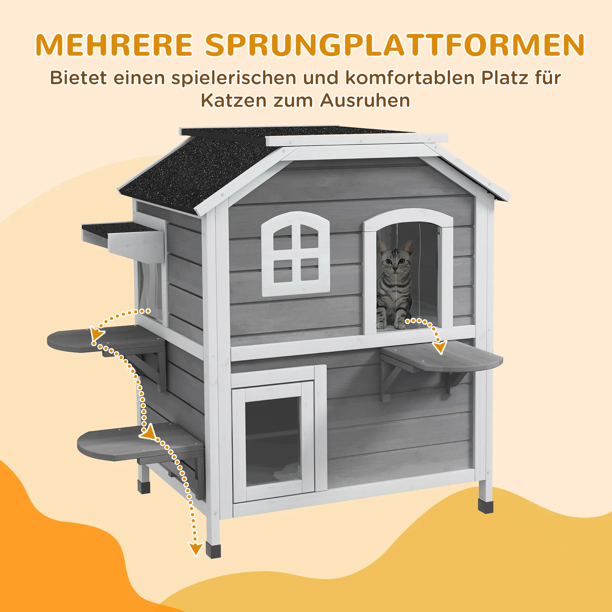 Katzenhaus aus Holz 2-Etagen Winterfest wasserdicht Katzenhütte mit Asphaltdach klappbarem Deckel Treppe Katzenhöhle Outdoor Schutzhütte für Draußen Garten Balkon 99,5 x 76 x 91 cm Grau