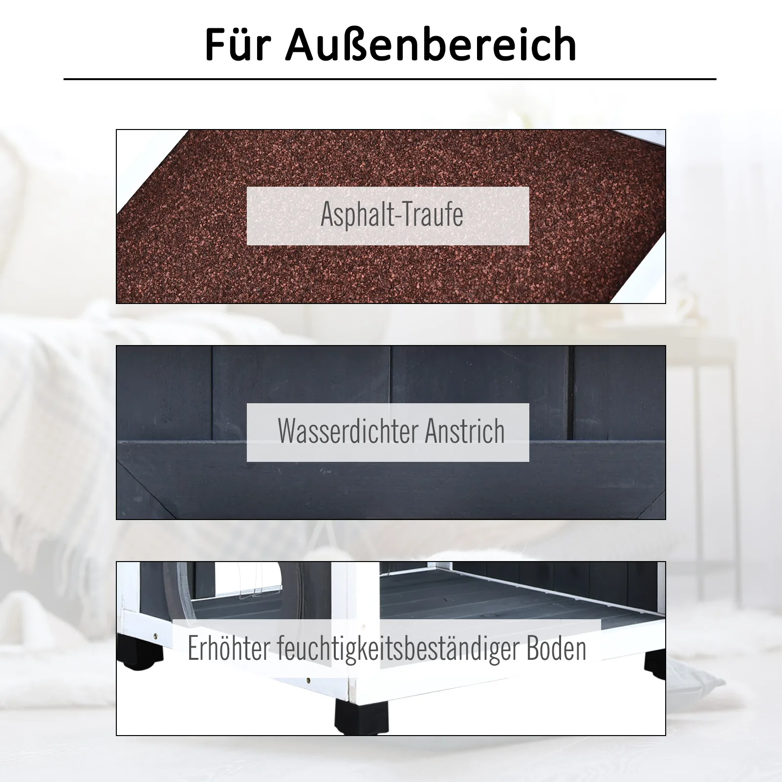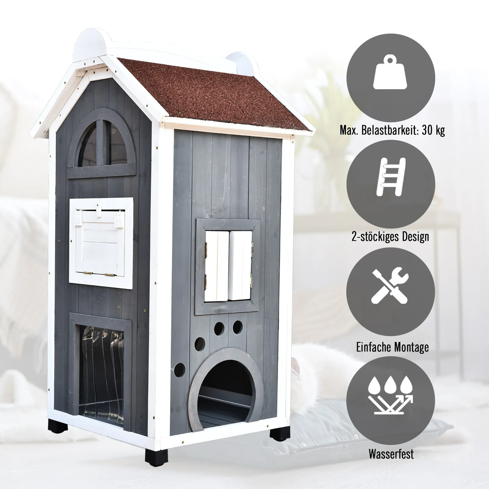 Katzenhaus für Draußen 2-stöckiges Katzenhaus aus Tannenholz, wetterfest Katzenhütte mit Asphaltdach, Grau, 59 x 55 x 109 cm