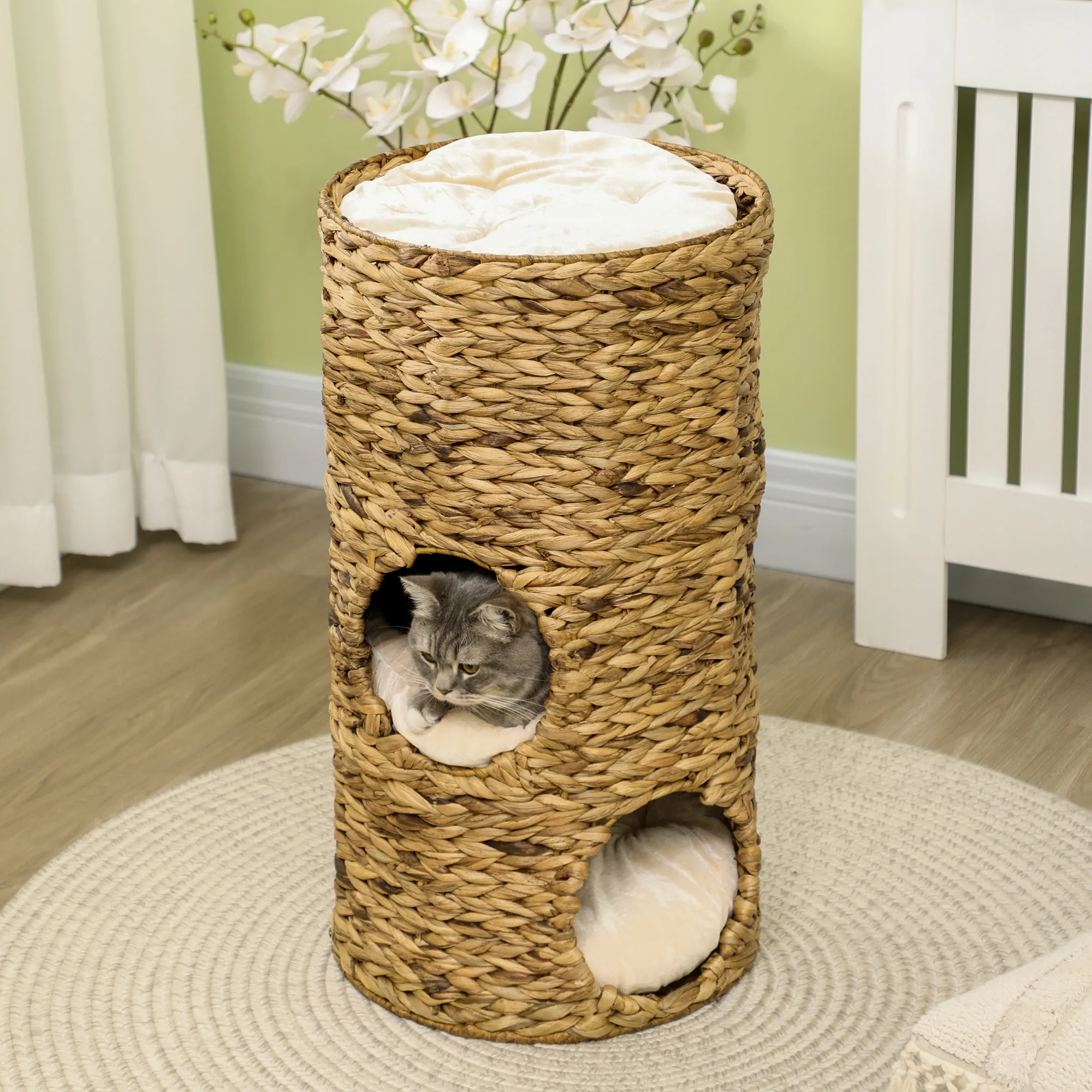 Katzenhöhle mit 3 Ebenen, 3 Eingänge, Boho-Design, inkl. Kissen, 40 cm x 40 cm x 73 cm, Hellbraun + Cremeweiß