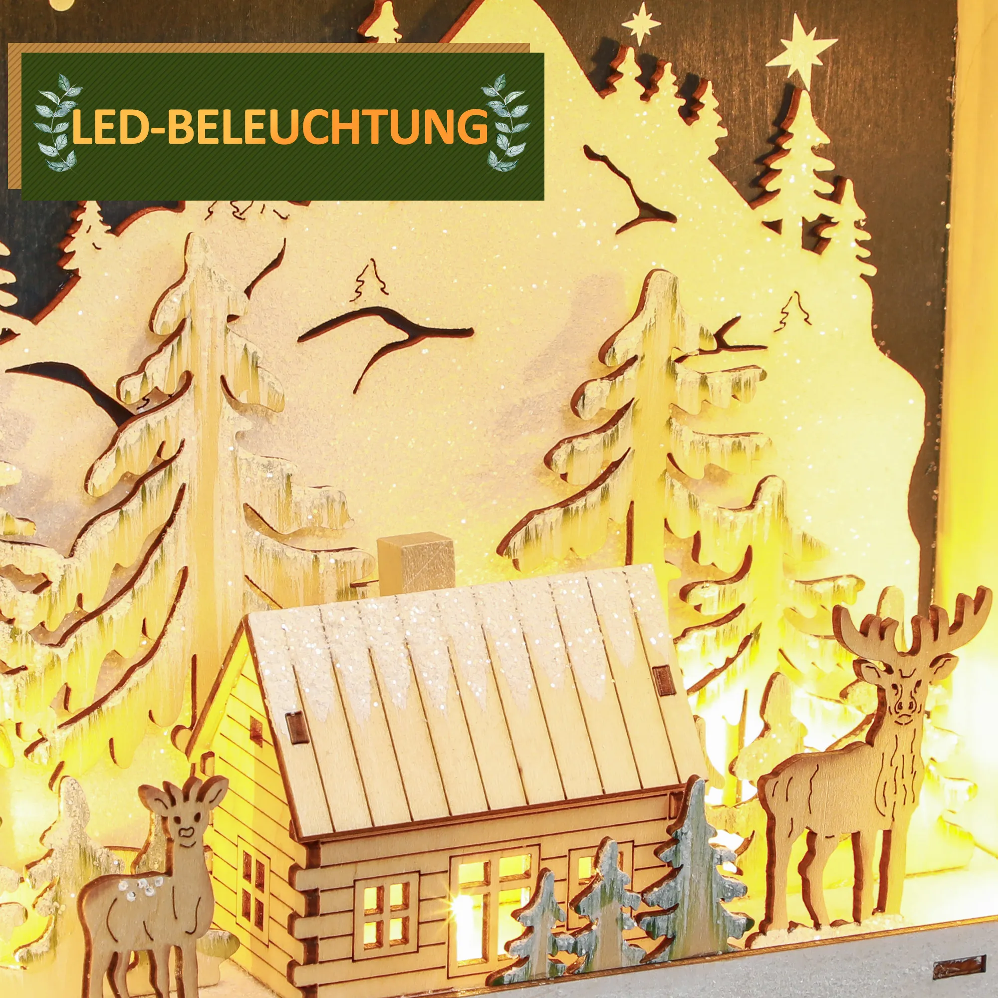Beschreibung:- Dörfer, Berge, Wälder, Elche und Sterne des Weihnachtskalenders bereichern die festliche Szenerie