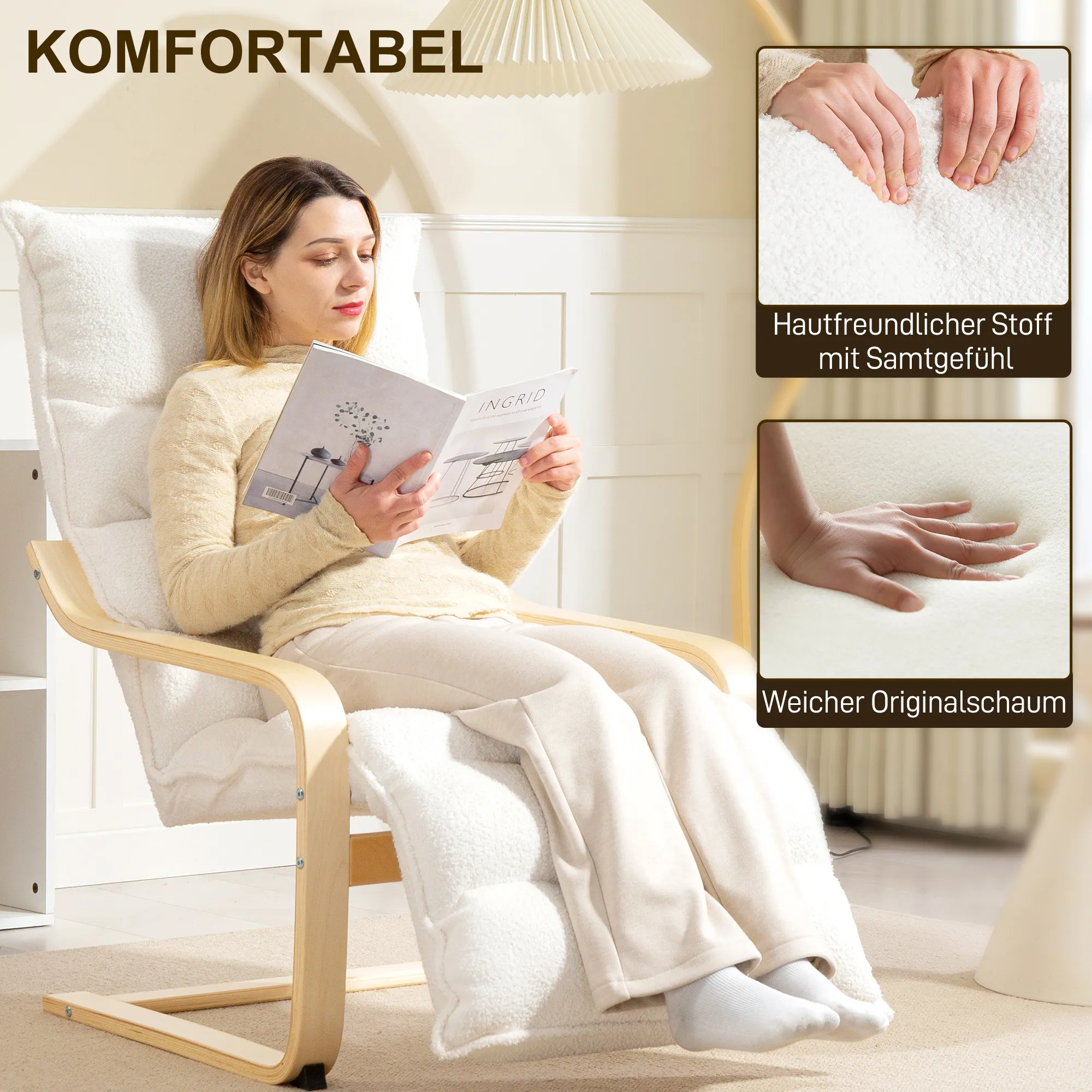 Tauchen Sie ein in den luxuriösen Komfort des Polstersessels, der mit atmungsaktivem Sherpa-Fleece und einer 12 cm dicken Polsterung ausgestattet ist. Als Lesestuhl oder stylischer Loungesessel verfügt er über eine hohe Rückenlehne und eine anpassbare Fußstütze, perfekt für Ihre Entspannung. Der leicht schaukelnde Rahmen aus Birkenholz verleiht ihm eine charmante Note, ideal für Wohn- oder Schlafzimmer.