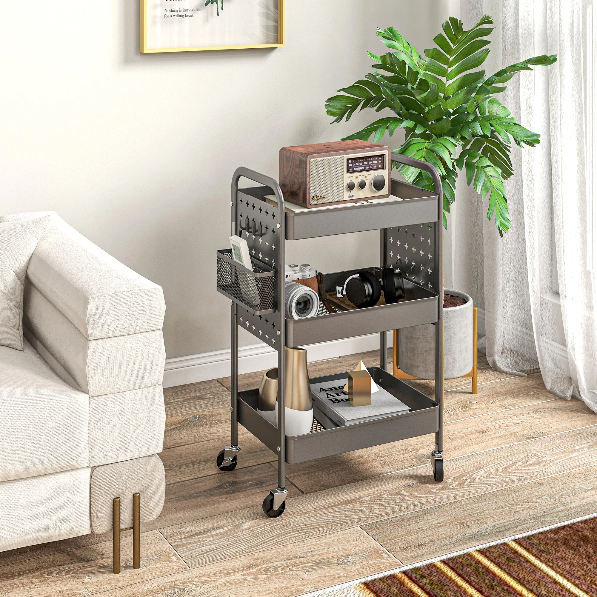 Dieser kompakte Rollwagen von ist ideal für kleine Räume, in denen mehr Stauraum benötigt wird. Die Gitterkörbe und die seitlichen Haken bieten viel Platz für verschiedene für Lebensmittel oder Zubehör. Ausgestattet mit leicht zu ziehenden Griffen für einen einfachen Transport. Vier leichtgängige Räder mit zwei Bremsen ermöglichen es Ihnen, den Nischenwagen zu bewegen, wo immer Sie ihn brauchen. Er kann als Badezimmerwagen, Servicewagen, Küchenwagen und Wäschewagen verwendet werden.