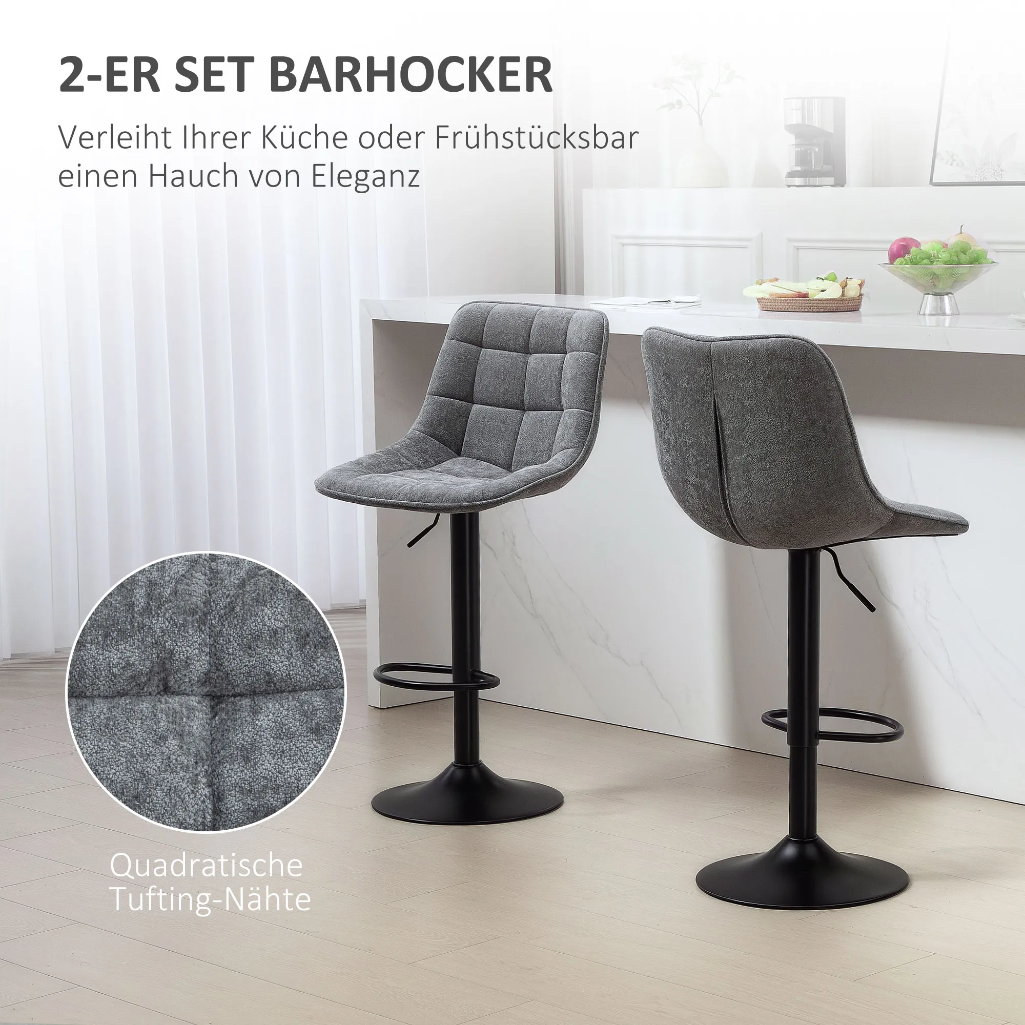 GenieÃen Sie erstklassigen Komfort mit unseren zwei Barstühlen, weich gepolstert für bequemes Sitzen. Die Barhocker sind höhenverstellbar und drehen sich um 360°. Ihre pulverbeschichtete Stahlbasis mit Gummiring bietet Stabilität und Bodenschutz. Perfekt für Kücheninseln oder Frühstücksbars, bringen sie moderne Eleganz in Ihren Raum.