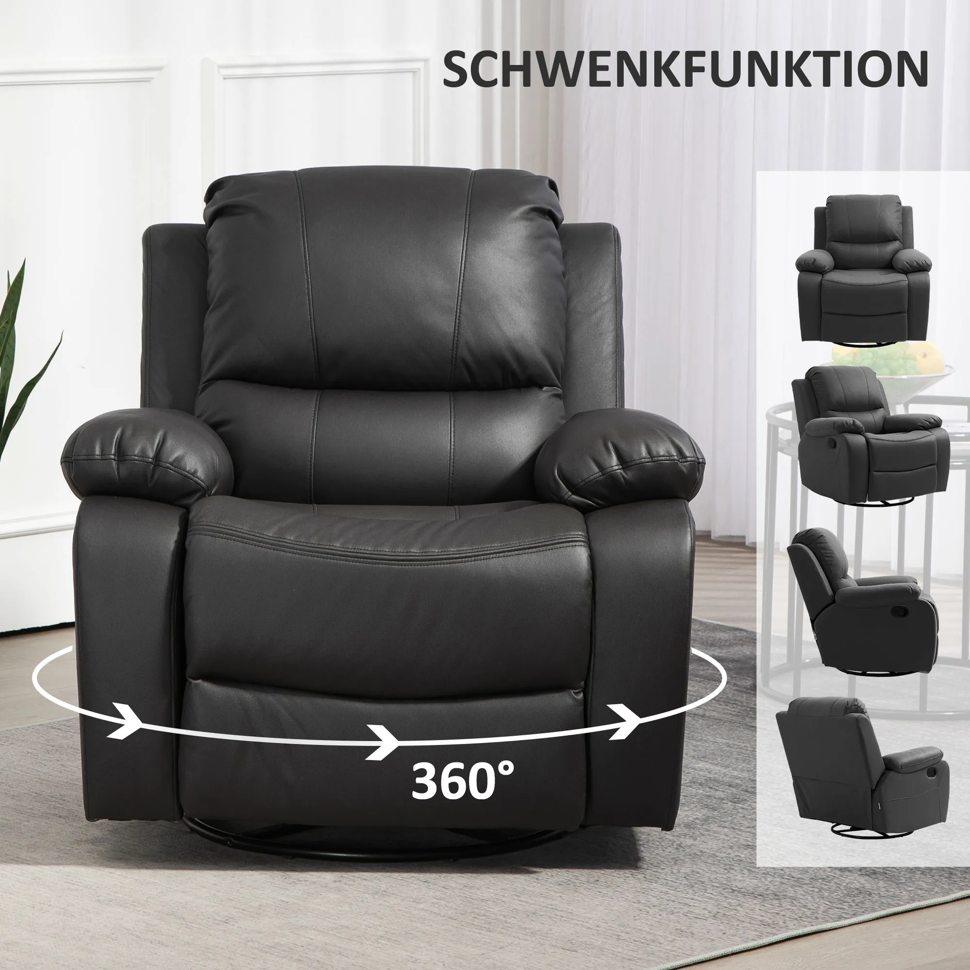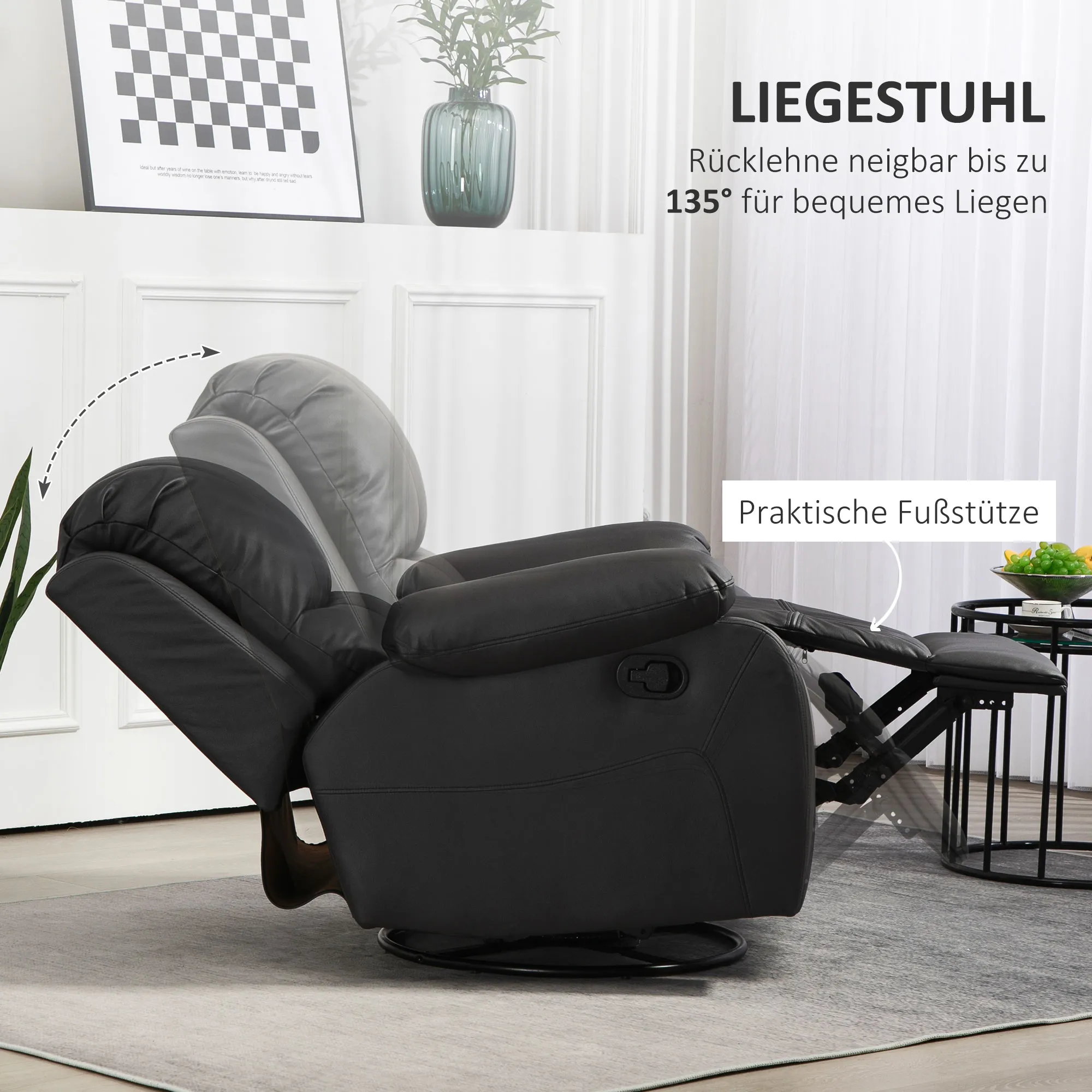 Relaxsessel, verstellbare Lehne & Fußstütze, drehbar, bis 150 kg, Stahlrahmen, 93x100x98cm, Schwarz