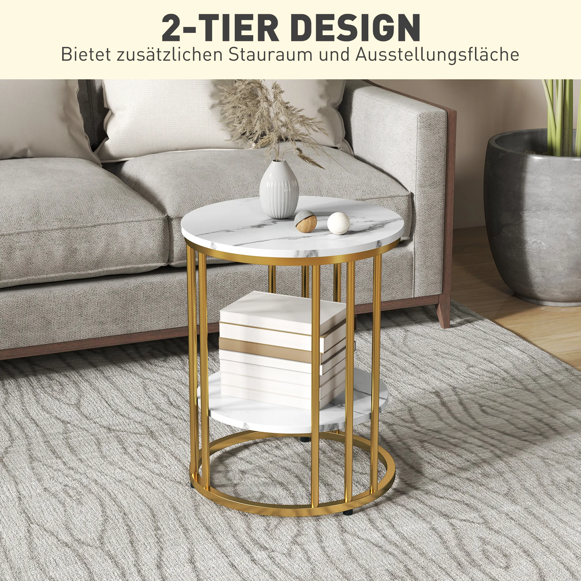 Optimieren Sie Ihre Wohnatmosphäre mit dem eleganten Couchtisch-Set. Dieses stilvolle Ensemble umfasst zwei vielseitige Beistelltische im Marmor-Look mit edlen goldfarbenen Metallbeinen, ideal zur gemeinsamen oder einzelnen Nutzung. Profitieren Sie von doppeltem Stauraum dank einer zweilagigen Tischplatte, perfekt für jegliche Anforderungen.