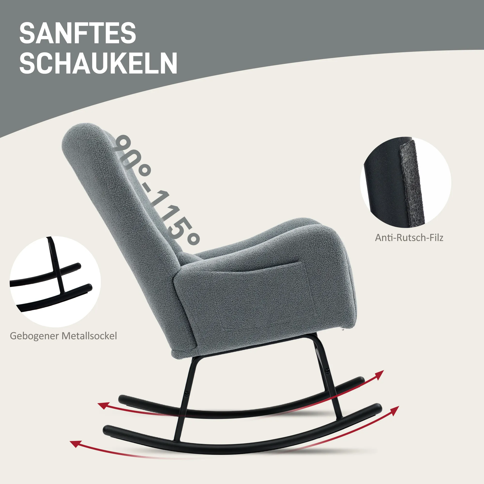 Genieße himmlischen Komfort mit diesem stilvollen Schaukelstuhl. Er bietet dir die Möglichkeit, zwischen 90° und 115° zu schaukeln und die perfekte Position für deine Entspannung zu finden.