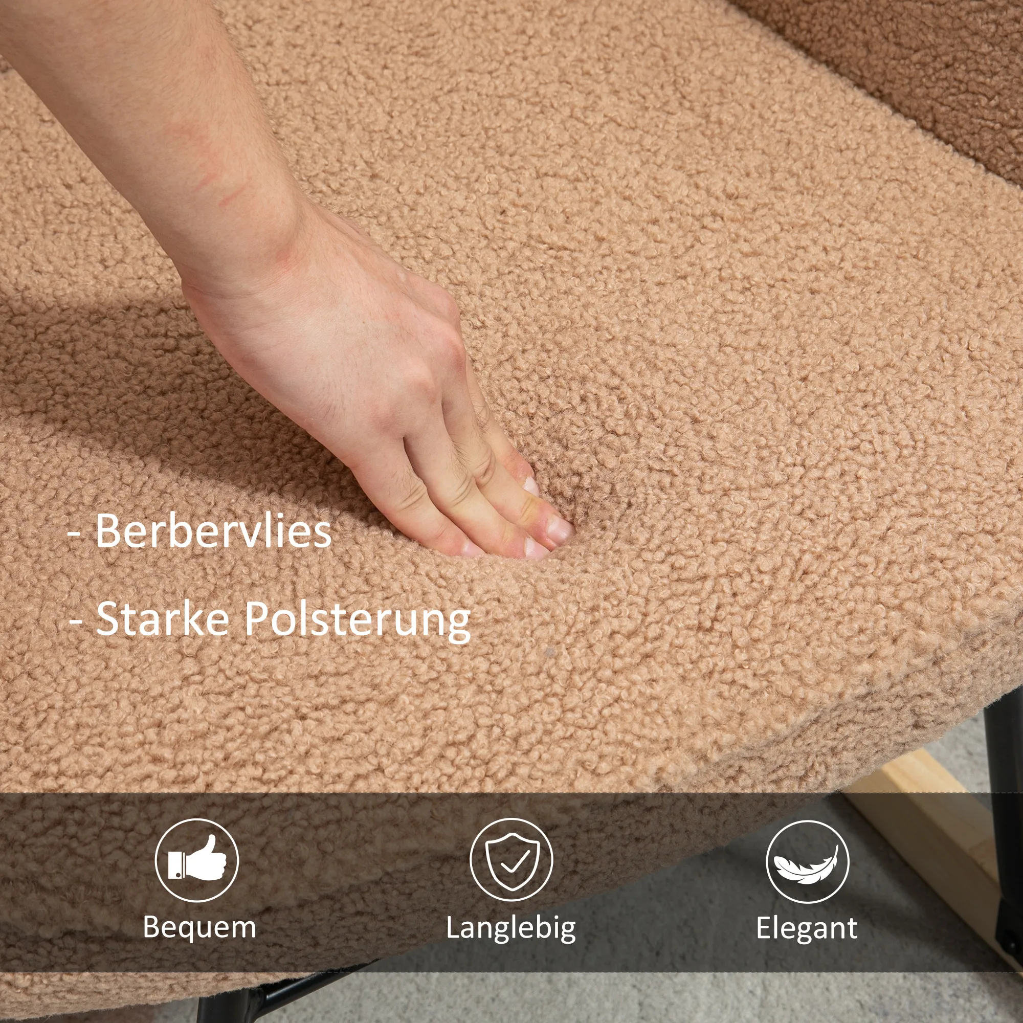 - Material: Berbervlies (100% Polyester), Buchenholz, Stahl, Schaumstoff