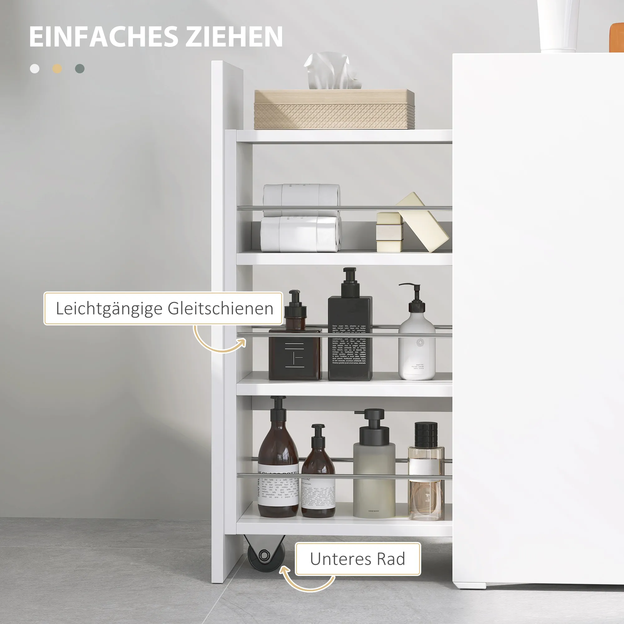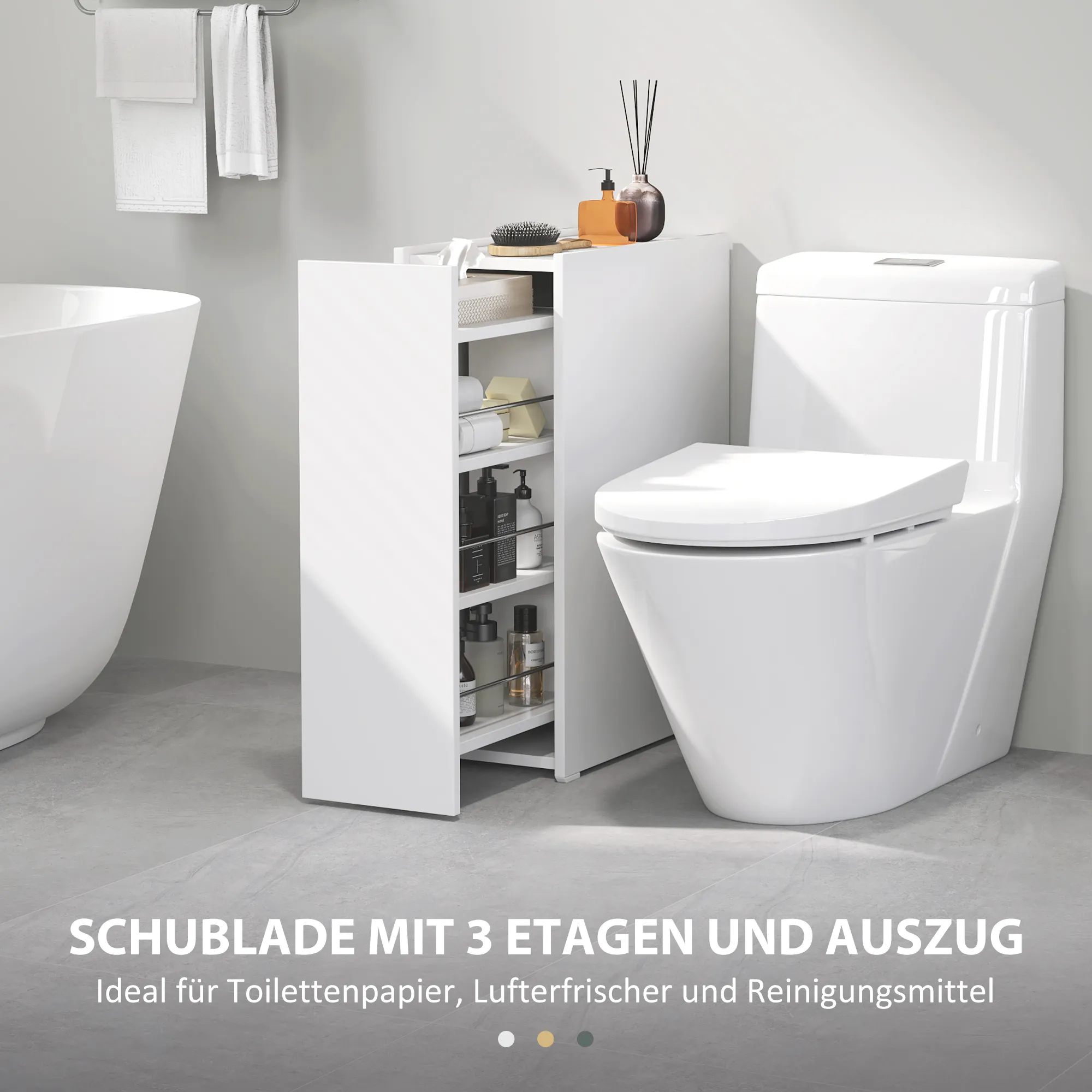 Erleben Sie schlichte Eleganz mit dem Badezimmerboden-Schrank von . Eine Schublade mit vier tiefen Ebenen bietet Platz für Toilettenpapier, Bleichmittel, Lufterfrischer und Reinigungsprodukte und gleitet leicht auf Schienen und Rädern. Kompakt und schlank, fügt sich dieses stilvolle, weiß getönte Möbelstück nahtlos in jede Nische ein und bereichert Ihr Bad durch sein schlichtes Design und den soliden Spanplattenrahmen.