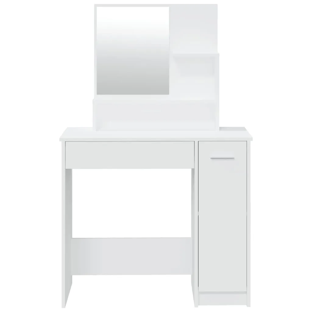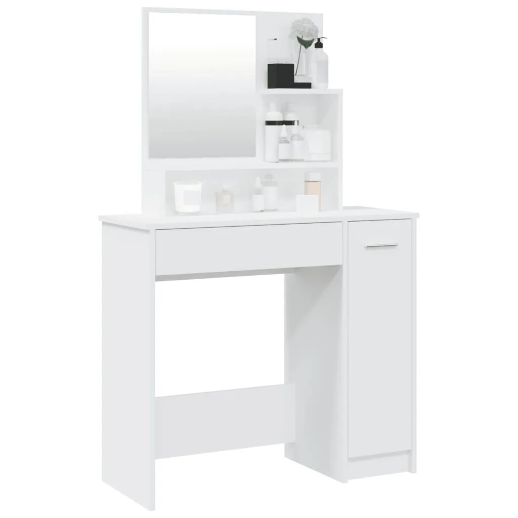 Dieser Frisiertisch verleiht deinem Schlafzimmer einen zeitlosen, raffinierten Look. Der Schminktisch mit Spiegel ist eine großartige Ergänzung zu deinem Schlafzimmerdekor und bietet auch Platz zur griffbereiten Aufbewahrung deiner Kosmetika! Erstklassiges Material: Holzwerkstoff ist ein Material hoher Qualität mit glatter Oberfläche, das sich durch Festigkeit, Robustheit und Feuchtigkeitsbeständigkeit auszeichnet. Aus Holzwerkstoff gefertigt, lässt sich der Schminktisch einfach reinigen.Viel Stauraum: Die Schublade und die Ablagen des Schminktisches bieten Platz zur ordentlichen Aufbewahrung deiner Kosmetika.Allzweckspiegel: Der schöne Spiegel bietet eine klare Sicht beim Auftragen von Make-up und verleiht dem Schminktisch eine elegante Note.Praktische Tür: Sorge für Ordnung in deinem Zimmer, indem du wichtige Kleinigkeiten in diesem Schminktisch hinter der Tür versteckst. Warnung:Um das Umkippen zu verhindern, muss dieses Produkt mit der mitgelieferten Wandhalterung gesichert werden. Hinweis:Jedes Produkt wird mit einer Montageanleitung in der Verpackung für eine einfache Montage geliefert.