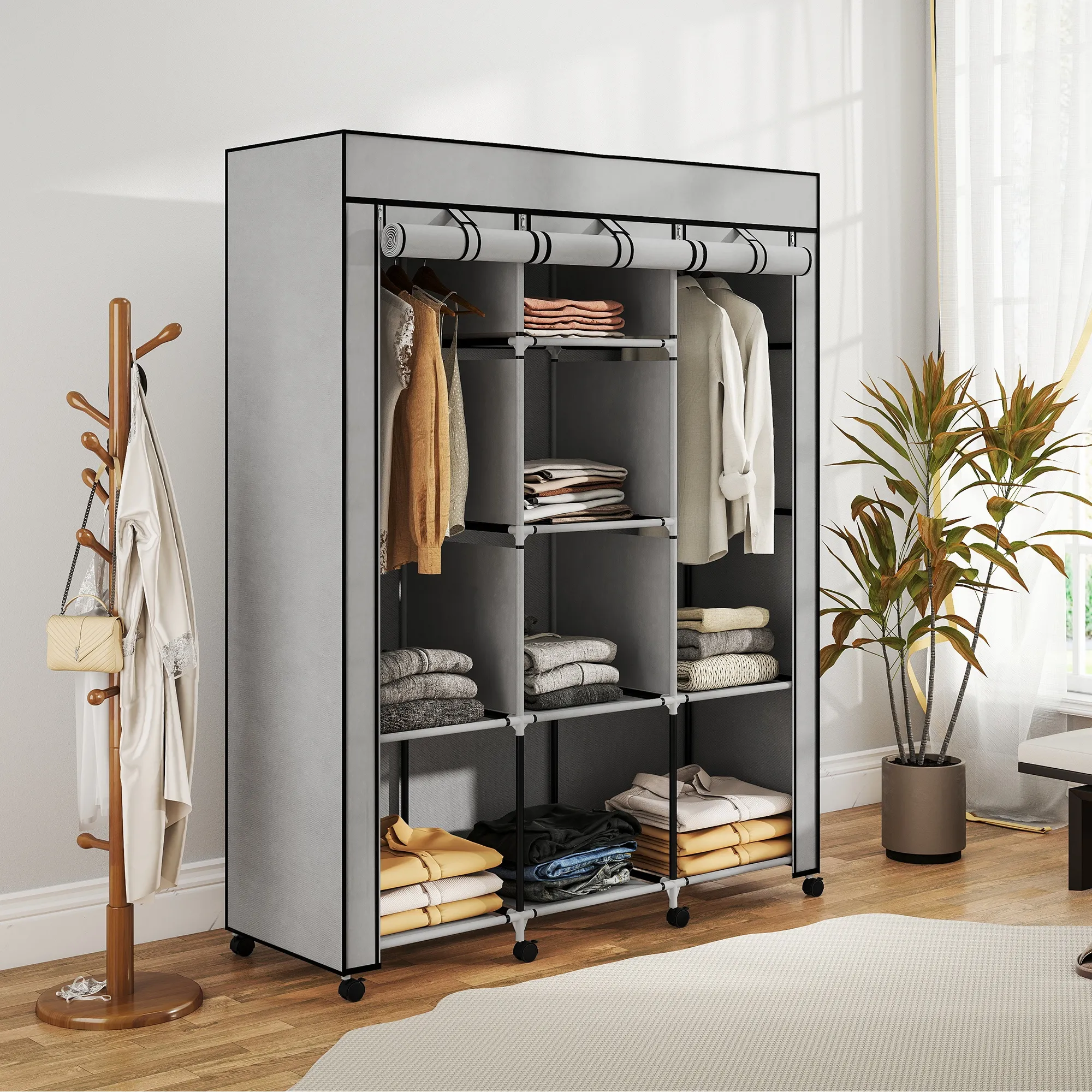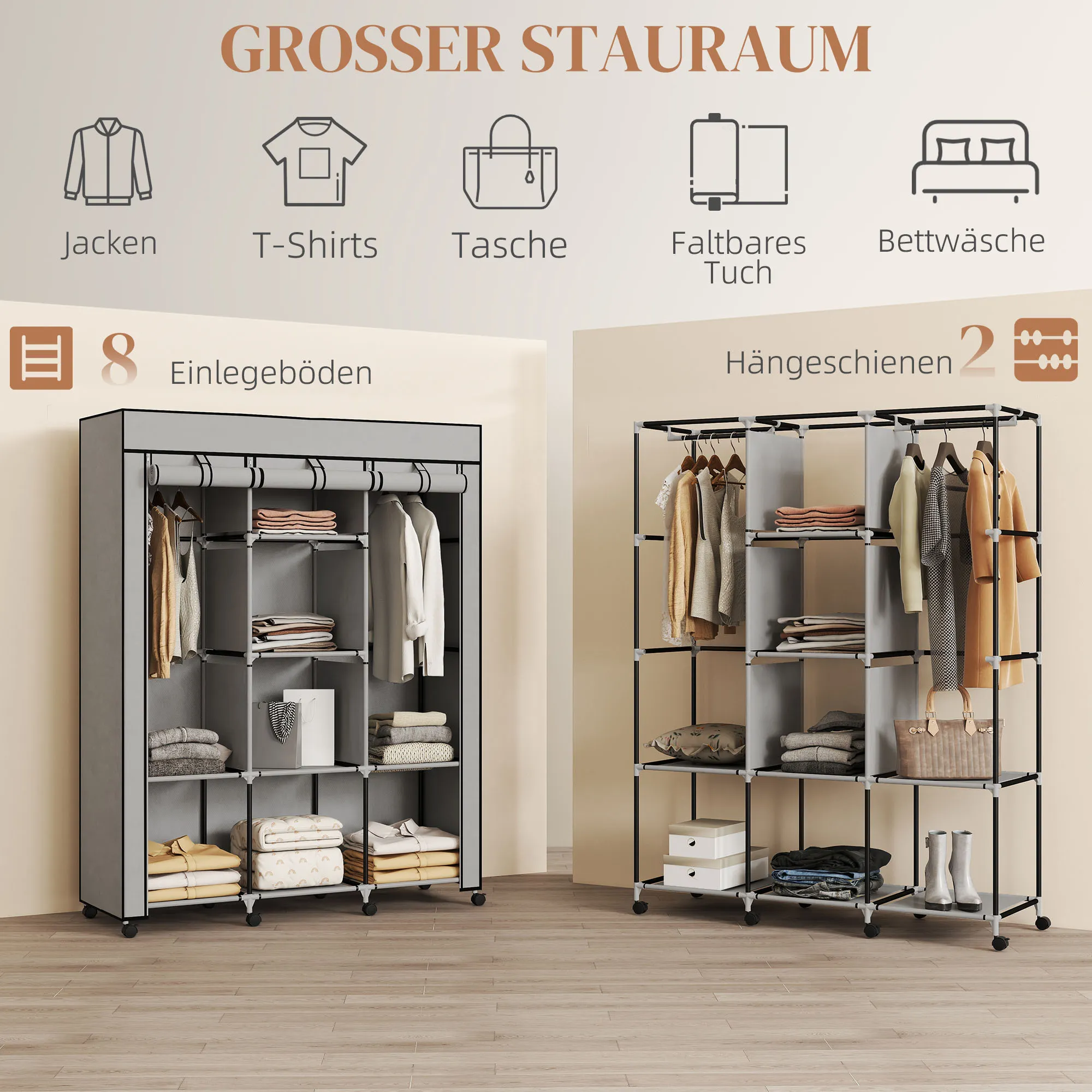 Schrank aus Stoff, Aufbewahrungslösung, 8 Regale, 2 Kleiderstangen, Grau