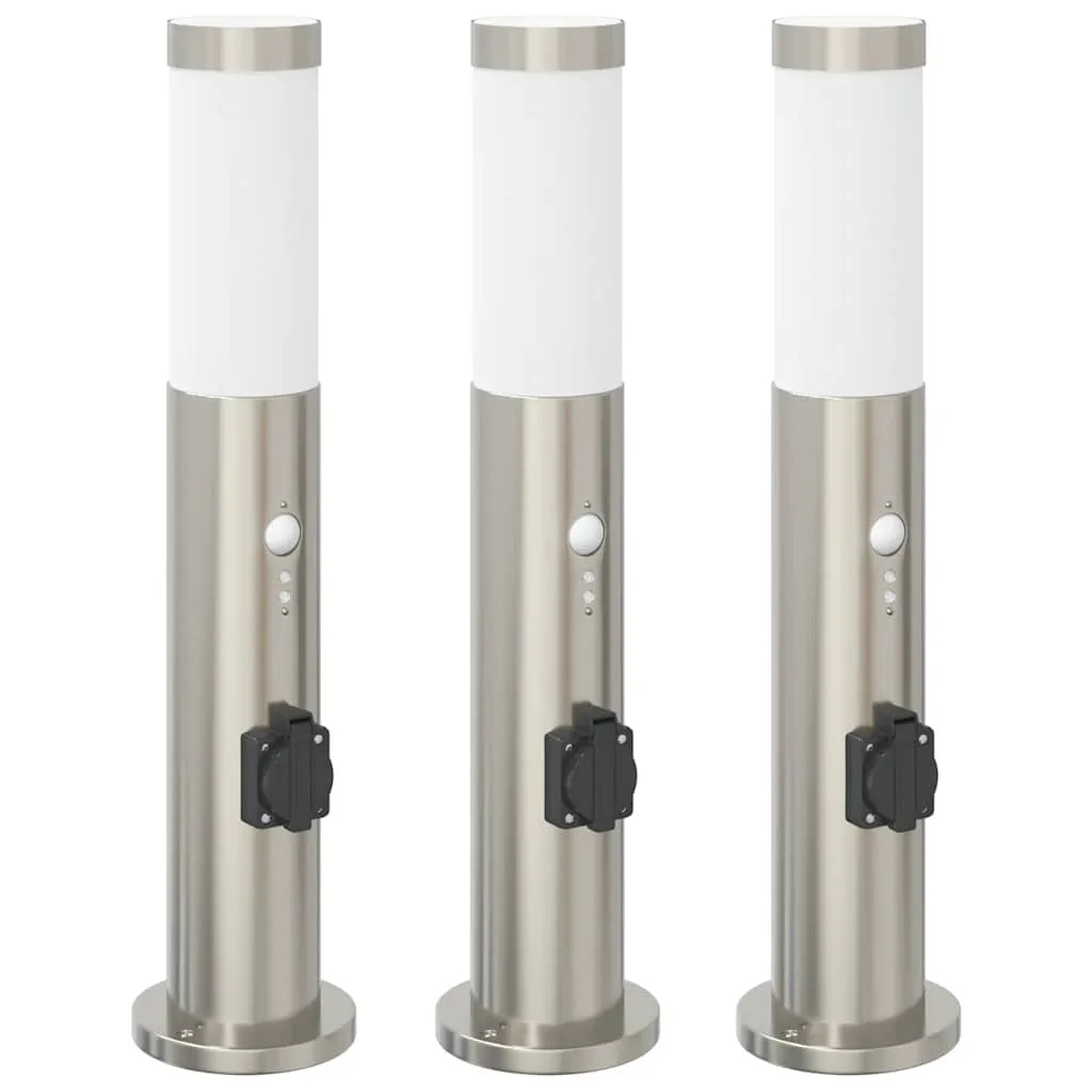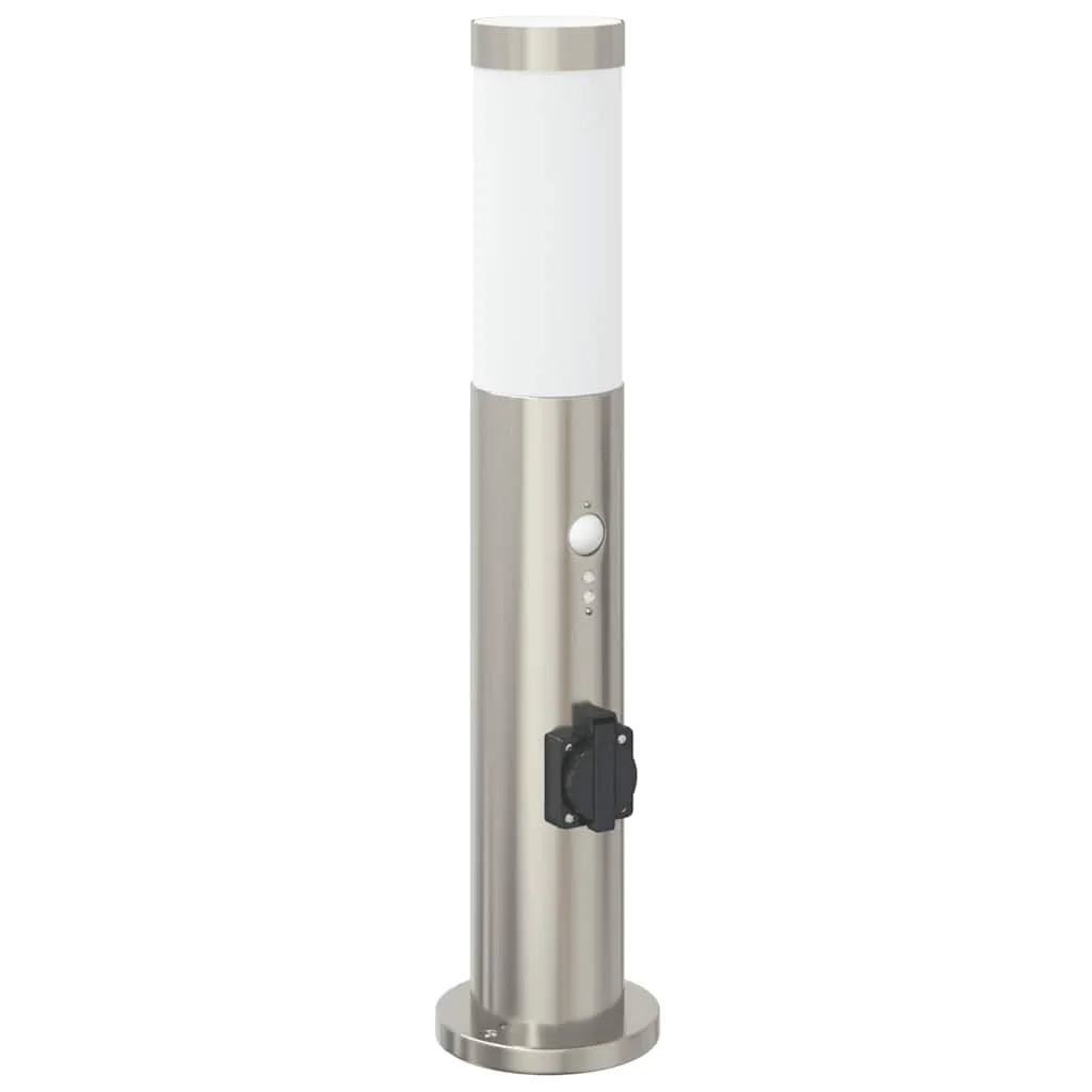 Silberne Edelstahl Pollerleuchte 11x50 cm mit Bewegungssensor und Steckdose