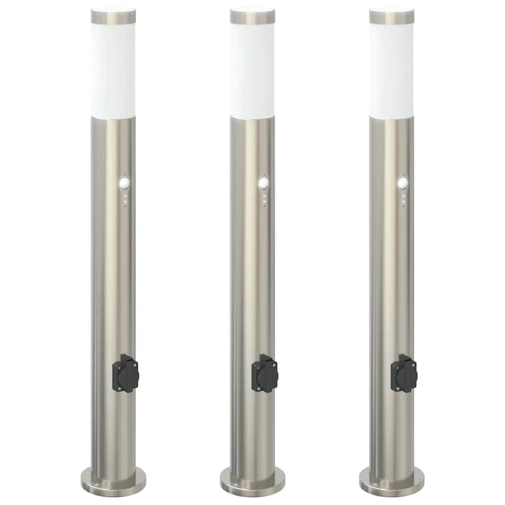 Silberne Edelstahl Pollerleuchte 11x80 cm mit Bewegungssensor und Steckdose