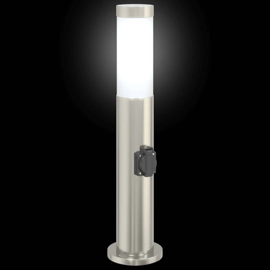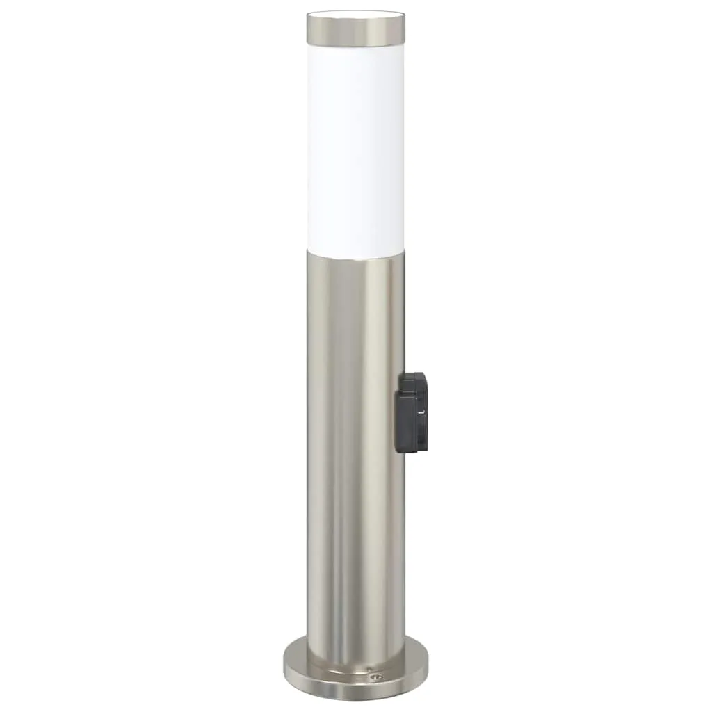 Silberne Pollerleuchte aus Edelstahl 11x50 cm mit integrierter Steckdose