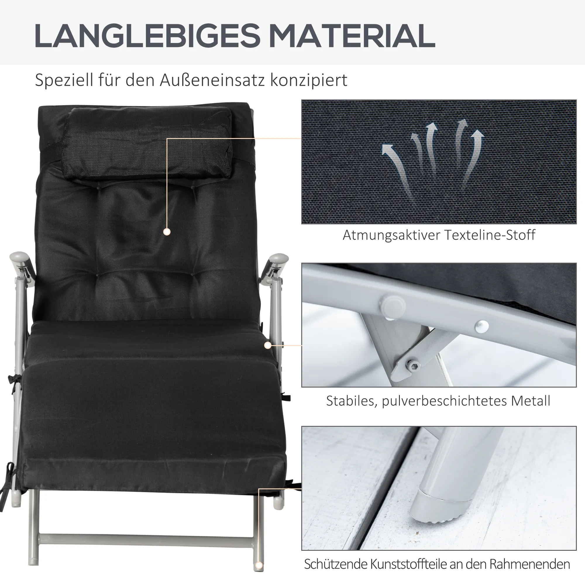 Sonnenliege klappbar Strandliege mit Kopfkissen Sitzkissen Liegestuhl mit 7-Fach verstellbare Rückenlehne Gartenliege Relaxliege bis 165 kg belastbar, für Garten Urlaub Outdoor, Schwarz