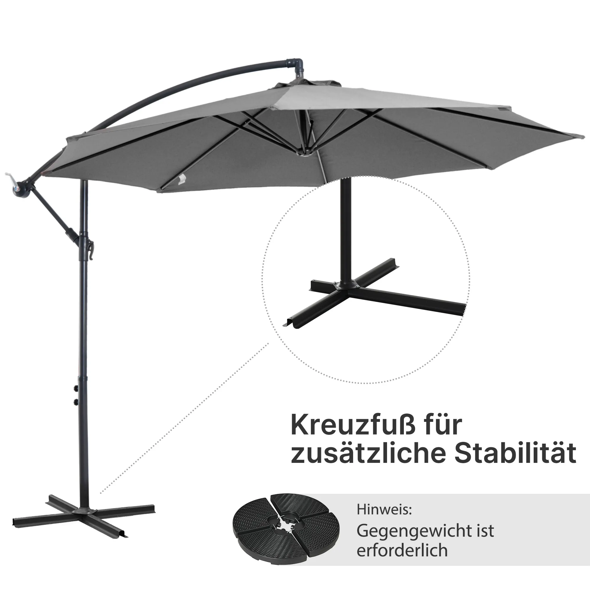 Unser hochwertiger und großer Ampelschirm von ist der perfekte Schattenspender für sonnige Tage. Vielseitig lässt er sich auf Ihrer Terrasse, Ihrem Balkon oder bei einer Feier einsetzen. Die Schirmstange besteht aus robustem Stahl. Der Sonnenschirm an sich ist aus wasserabweisendem Polyester gefertigt. Der Neigungswinkel des Schirmbezugs lässt sich flexibel einstellen, damit Sie den besten Schutz vor starker Sonneneinstrahlung genießen. Dank der Handkurbel lässt sich Ihr Gartenschirm einfach öffnen und schließen. Da kann der Sommer kommen!