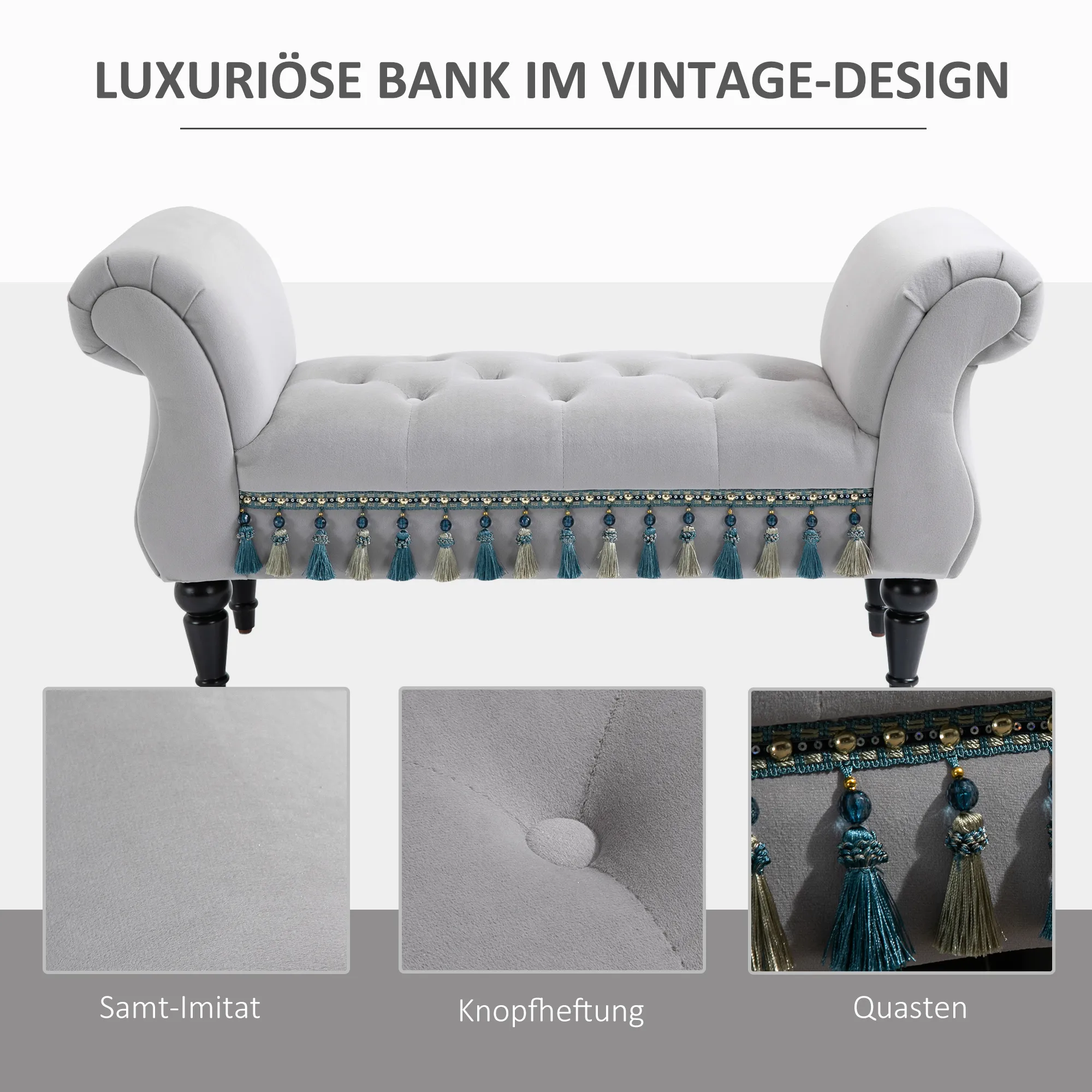 Verleihe deinem Zuhause einen Hauch von Eleganz mit dieser stilvollen Sitzbank. Ihr luxuriöses Vintage-Design, gekennzeichnet durch die schöne Knopfheftung und geschwungene Formen, zitiert die Ästhetik vergangener Epochen. Gefertigt aus robustem Massivholz, garantiert diese Bettbank Stabilität und Langlebigkeit.