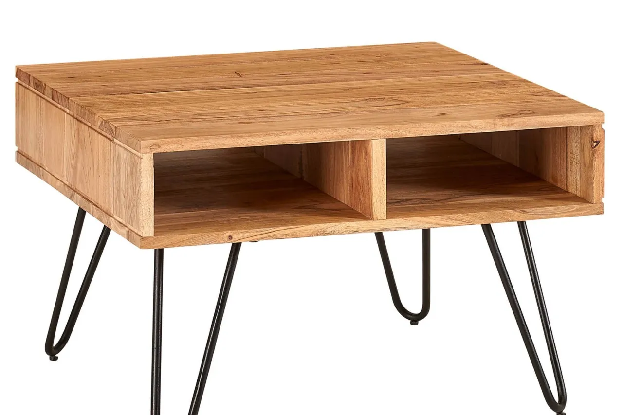 - Getragen wird die quadratische Tischplatte von vier stabilen Haarnadelbeinen