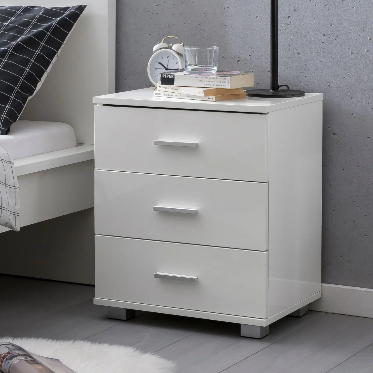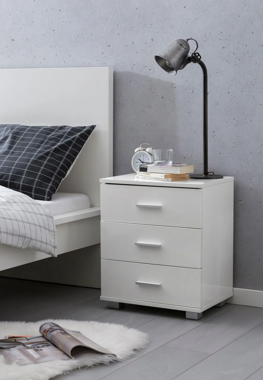 - Farbe: Kompletter Nachtkasten: Weiß (Hochglanz) / Griffe: Silberfarben