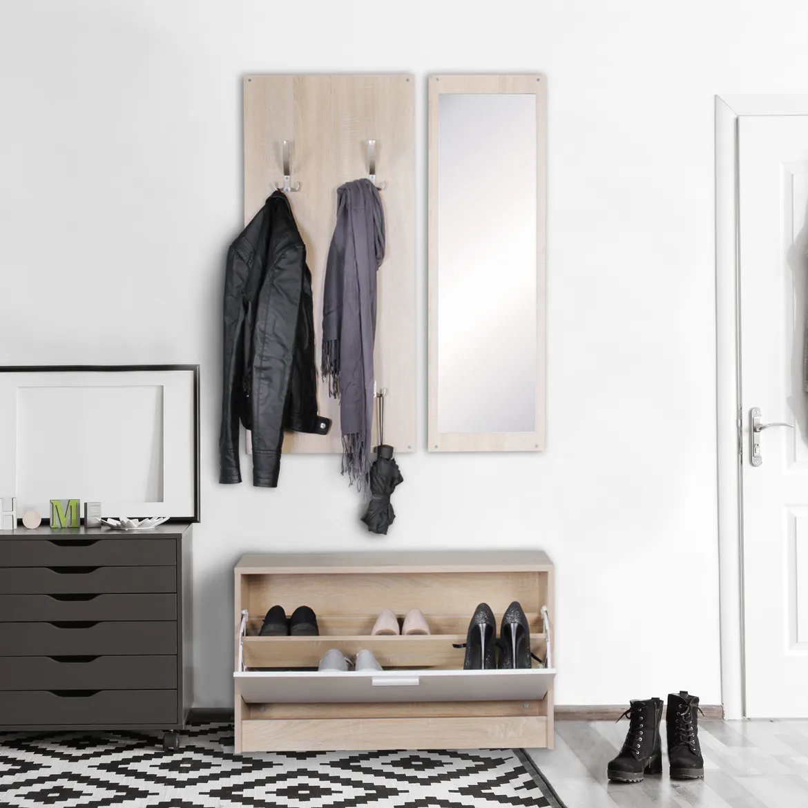 tinkaro eckige Wand-Garderobe BUSID Holz 012182 Flur-Kompaktgarderobe mit Spiegel & Schuhschrank Sonoma
