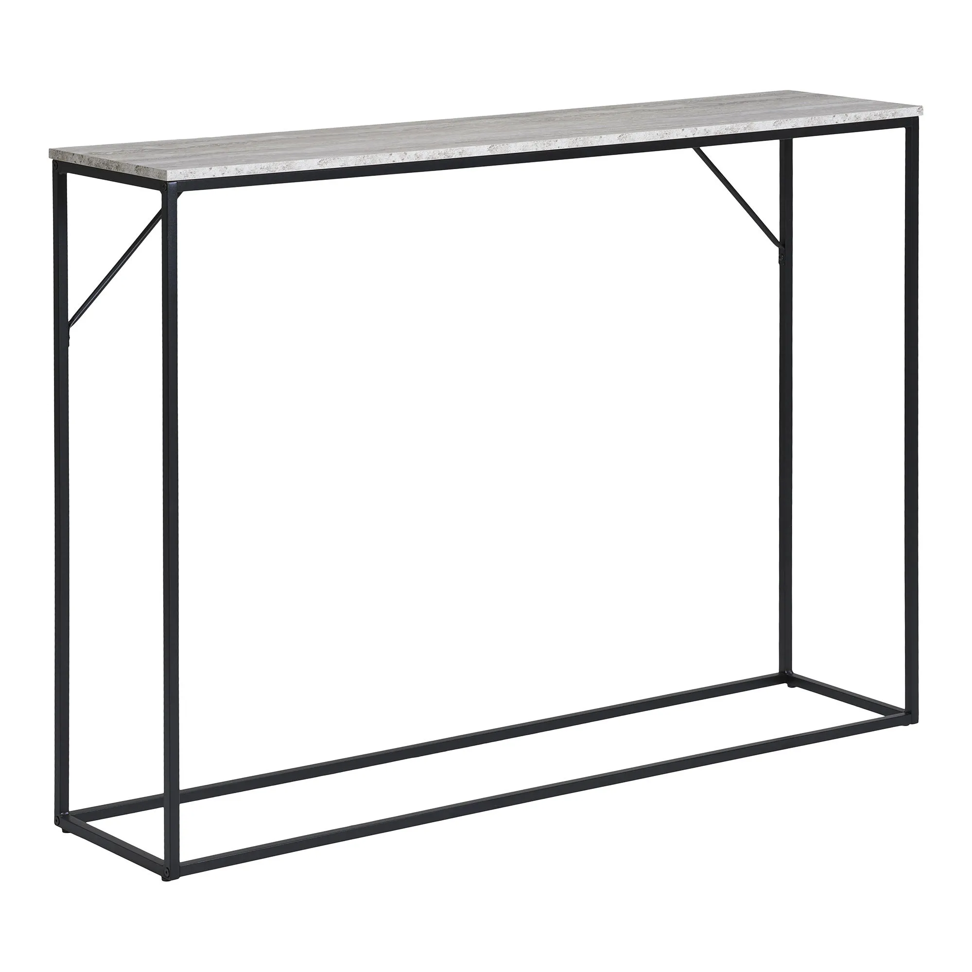 Der Konsolentisch Vita vereint modernen Stil mit funktionaler Eleganz. Mit seiner schlichten, rechteckigen Form und der robusten Bauweise ist dieser Tisch die perfekte Ergänzung für jedes zeitgenössische Zuhause. Die Farbkombination aus schwarzem Metallgestell und einer hellen Tischplatte in Betonoptik schafft einen ansprechenden Kontrast und setzt stilvolle Akzente in Ihrem Wohnraum.