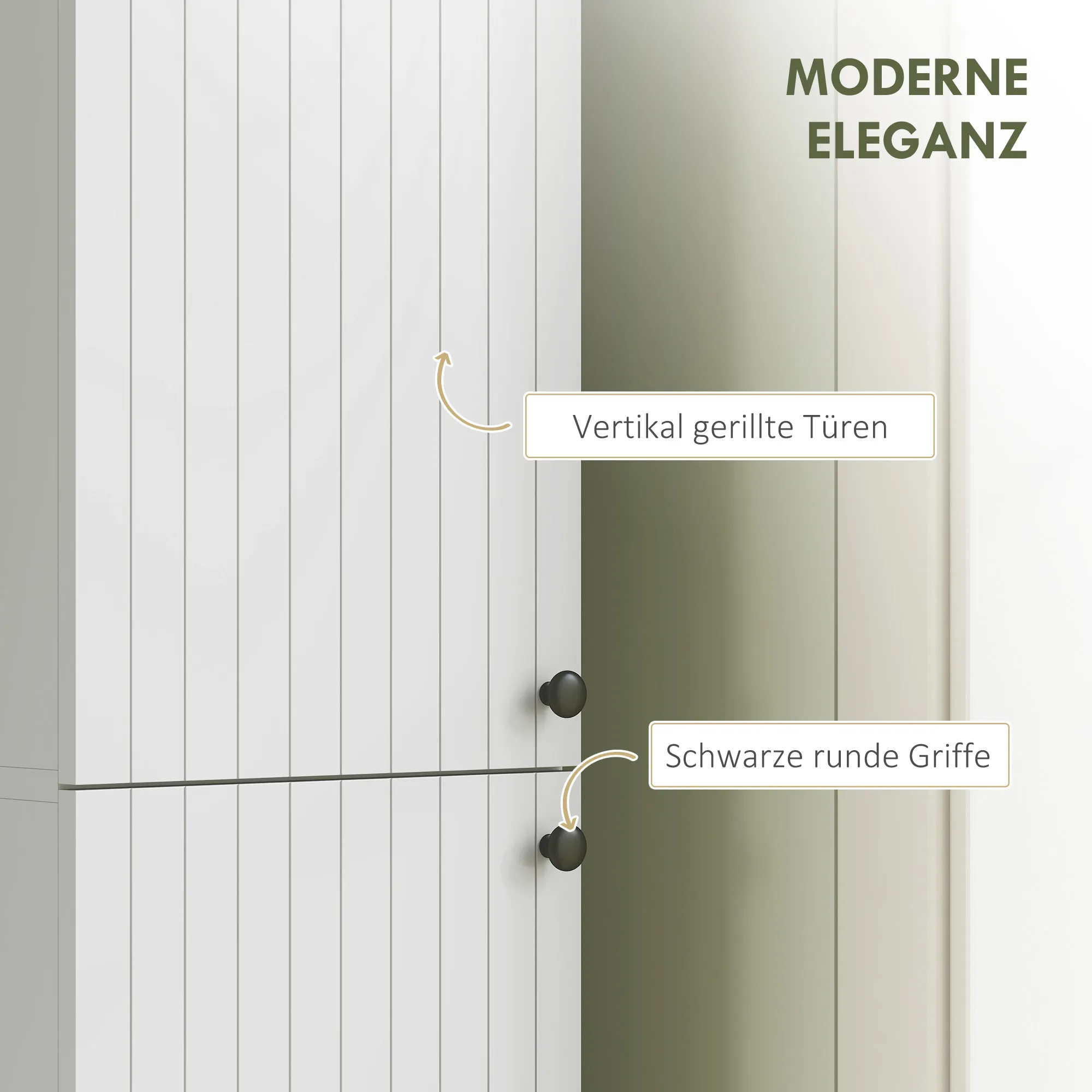- Vertikal gerillte Türen in weißer Ausführung mit schwarzen Knöpfen für einen modernen Look