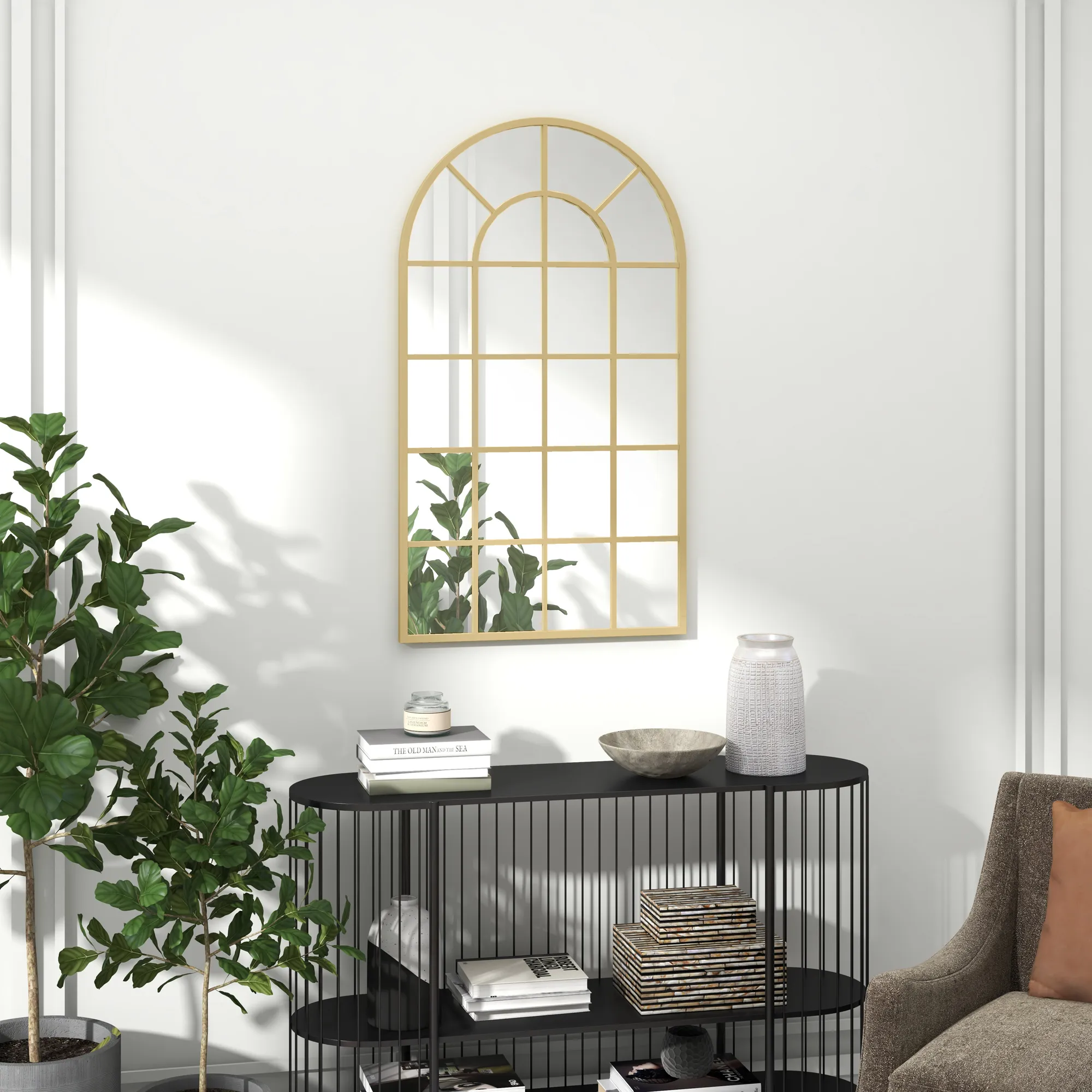 Beschreibung:- Bogenfensterrahmen des Wandspiegels mit integriertem Spalier für stilvolle Akzente
